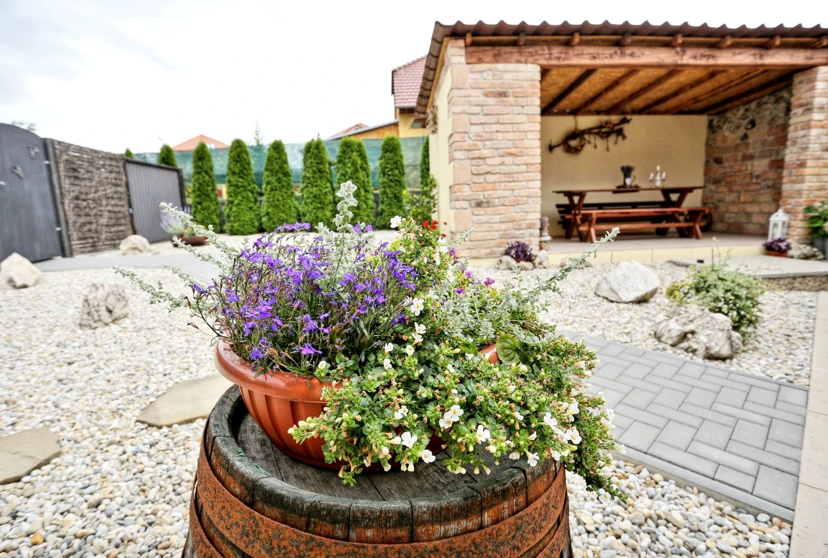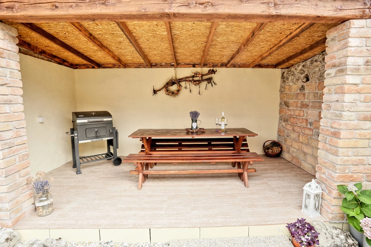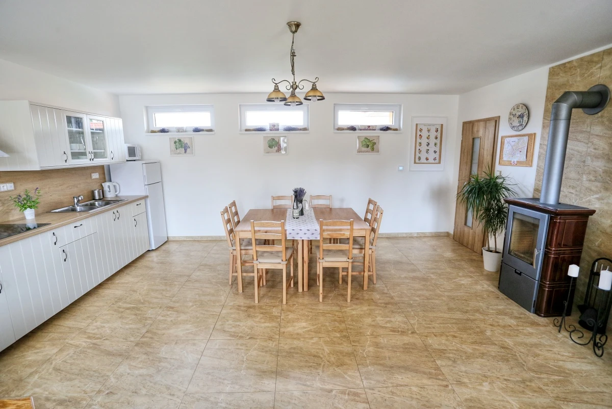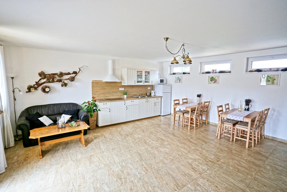 K dispozici je plně vybavená kuchyň s jídelnou a společenská místnost s krbovými kamny. V uzavřeném dvoře se nachází terasa s krytým posezením, zahradním grilem a degustačním sklípkem.