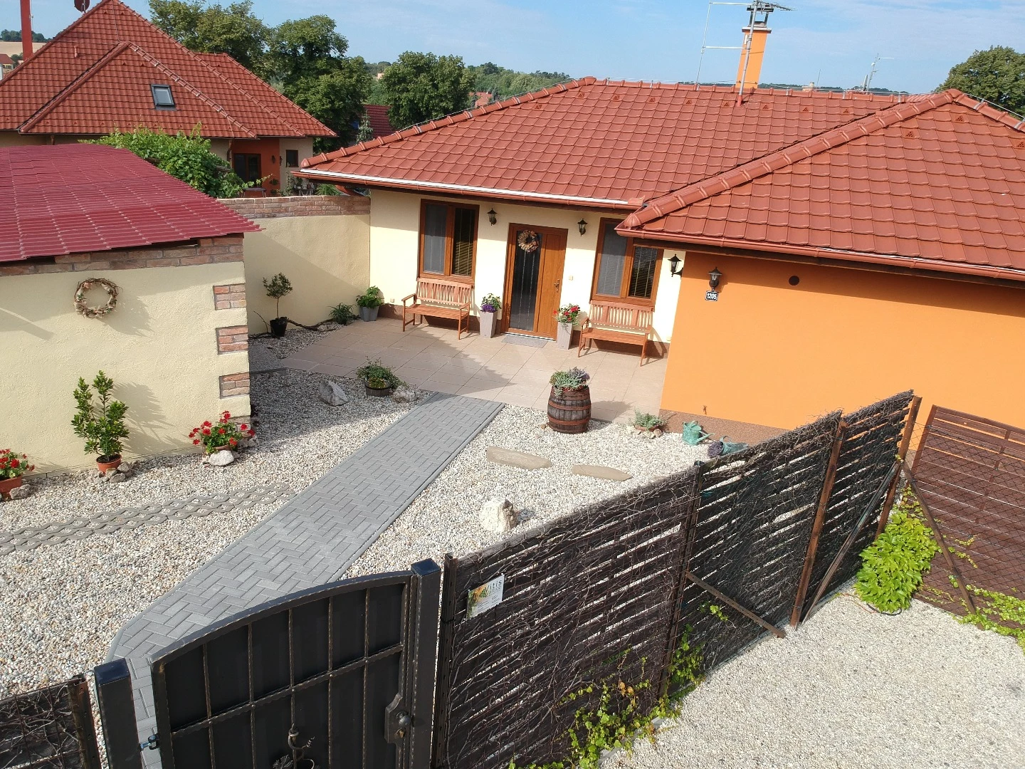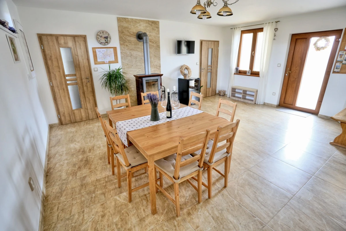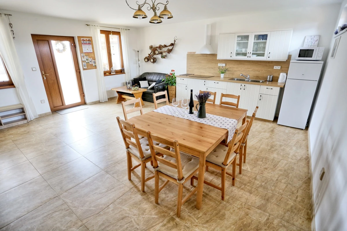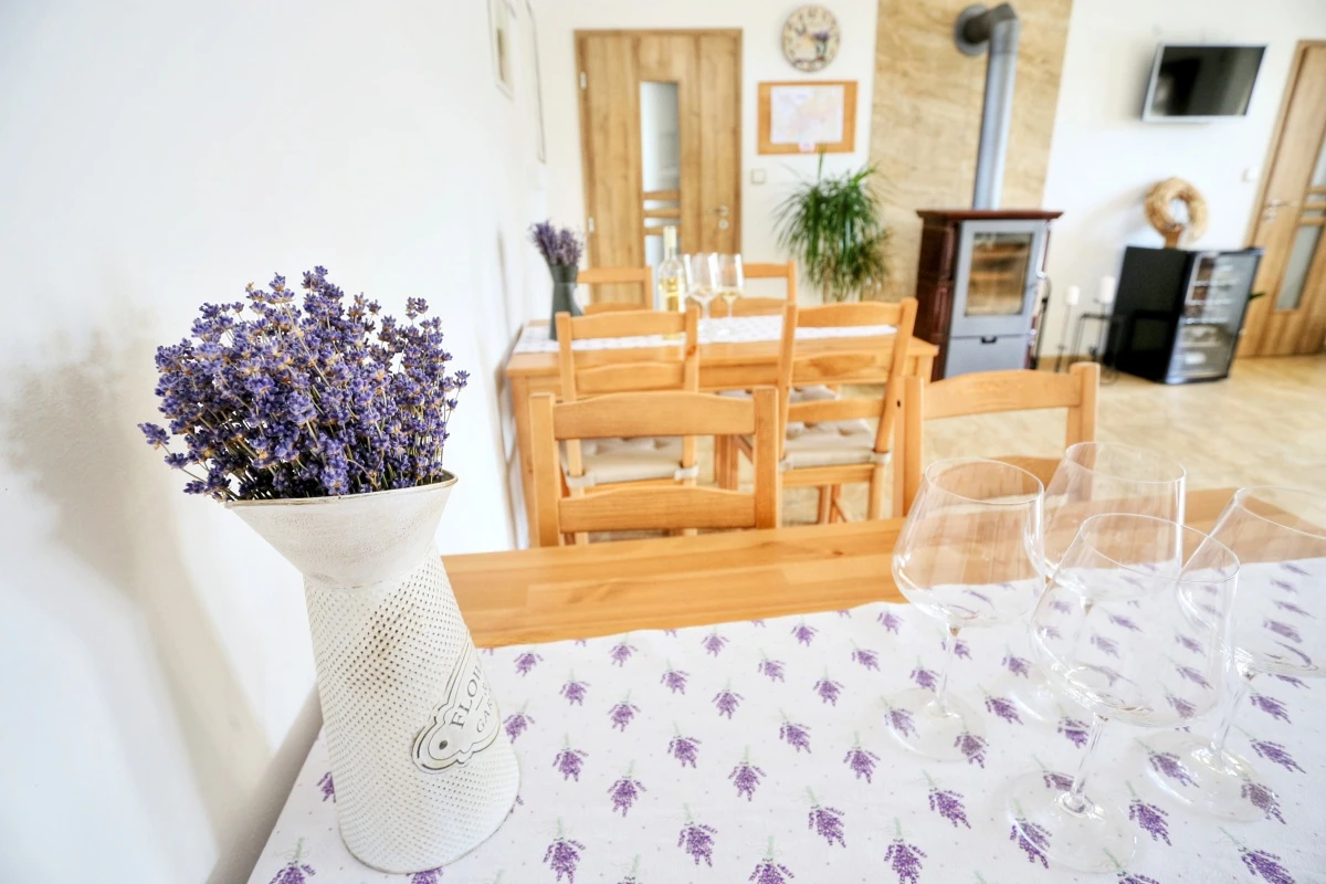 Domek nabízí čtyři dvoulůžkové pokoje, každý s vlastní koupelnou a toaletou. Dva pokoje jsou vybaveny manželskou postelí, další dva mají samostatná lůžka. Hosté mají k dispozici plně vybavenou kuchyň s myčkou nádobí, kávovarem a jídelním koutem. Součástí je také společenská místnost s krbovými kamny. V uzavřeném dvoře se nachází terasa s krytým posezením, zahradním grilem a degustačním sklípkem. Pro úschovu kol je k dispozici krytý uzamykatelný přístřešek. Wi-Fi připojení je zdarma.