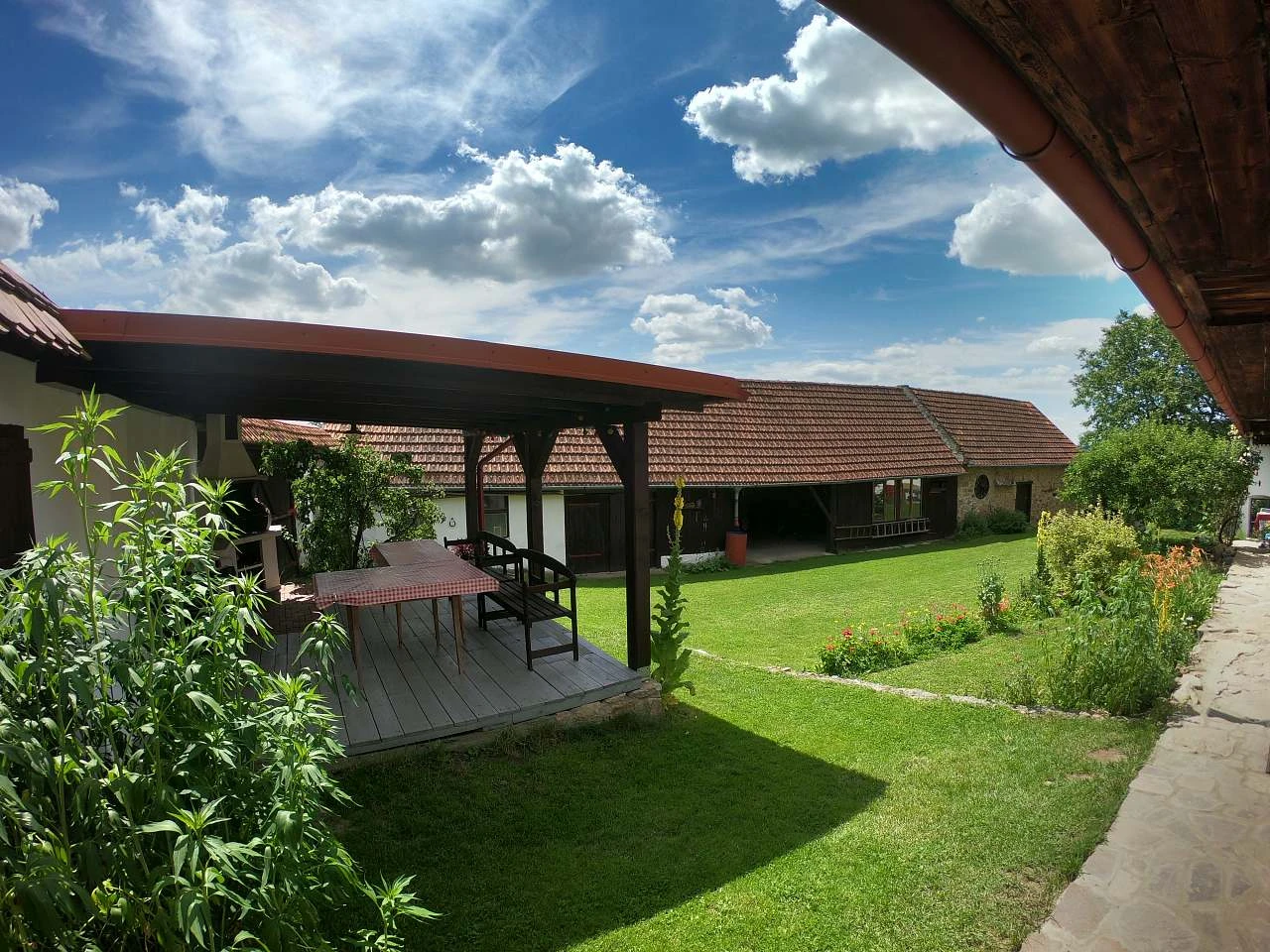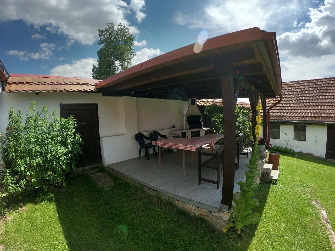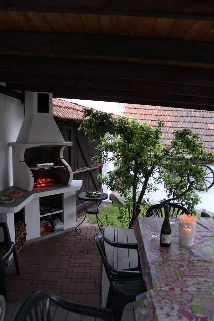 Pro posezení na dvoře můžete využít zastřešenou pergolu s grilem (dřevěné uhlí není v ceně).