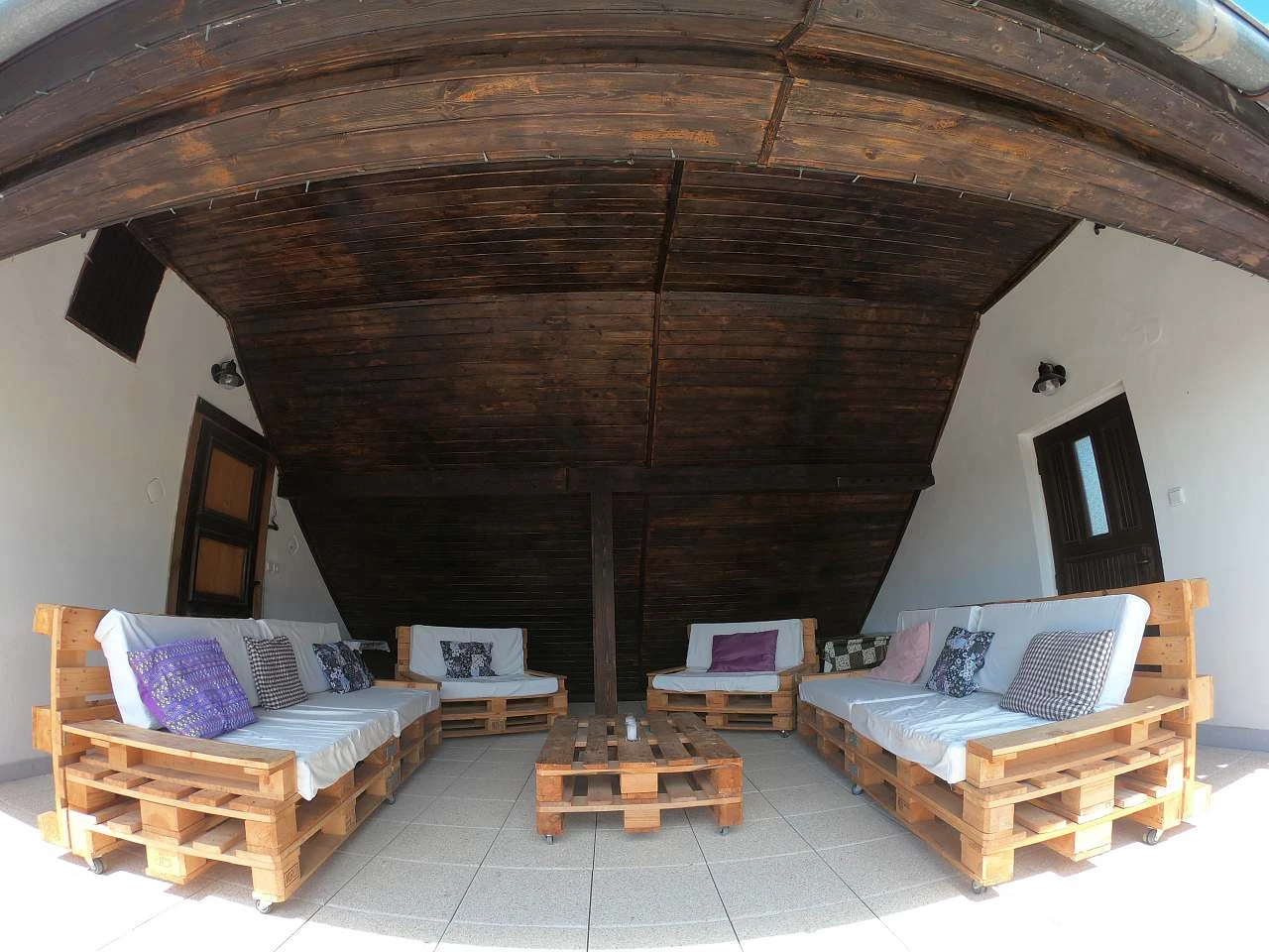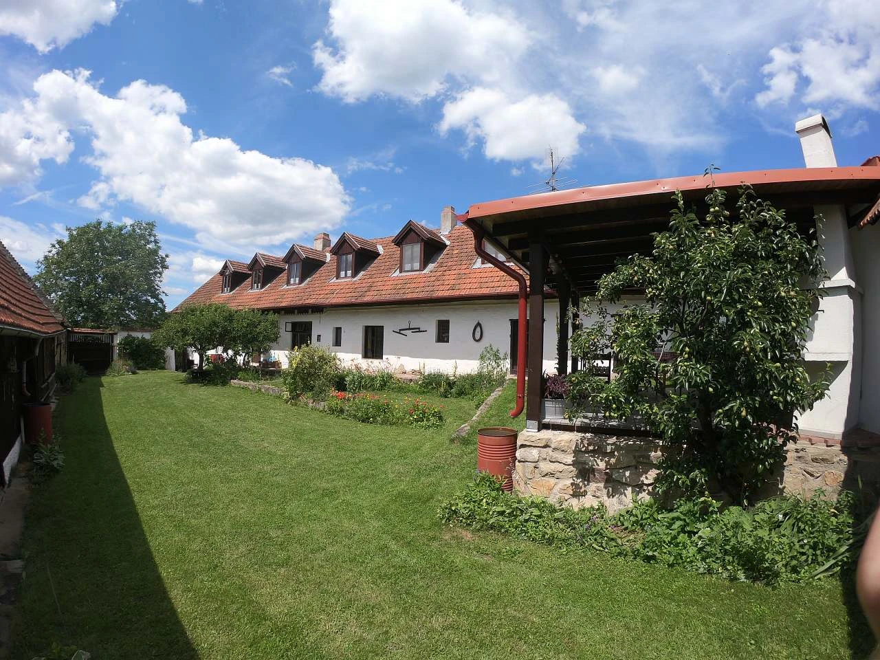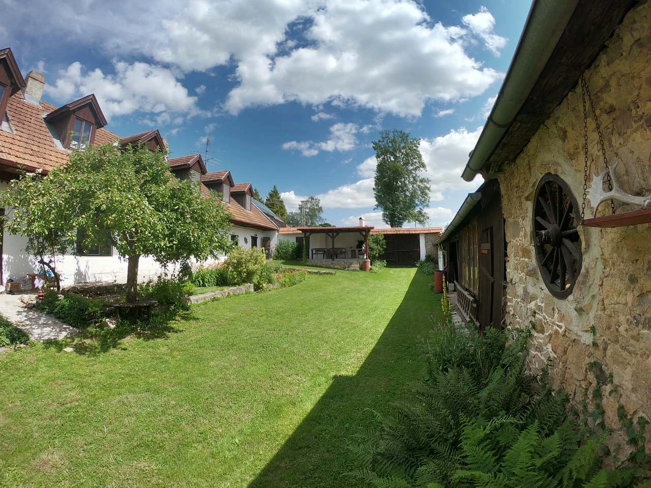 Pro posezení na dvoře můžete využít zastřešenou pergolu s grilem (dřevěné uhlí není v ceně).