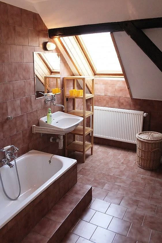 Chalupa má dvě koupelny - jedna se sprchovým koutem, druhá je prostornější s vanou, umyvadlem a vybavená pračkou. K dispozici jsou dále dvě samostatná WC s umyvadlem.