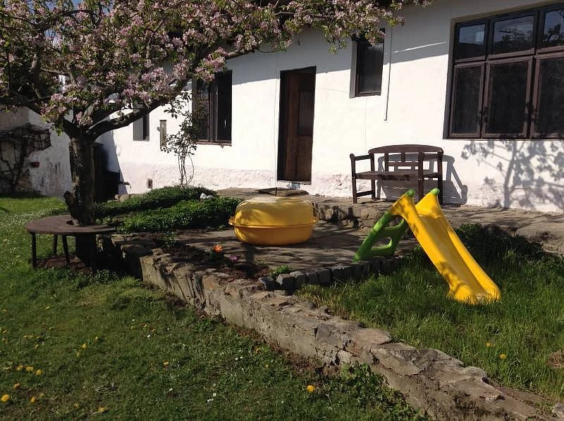 Pro malé děti je na dvoře skluzavka, kuchyňka, pískoviště a malé vozítko.