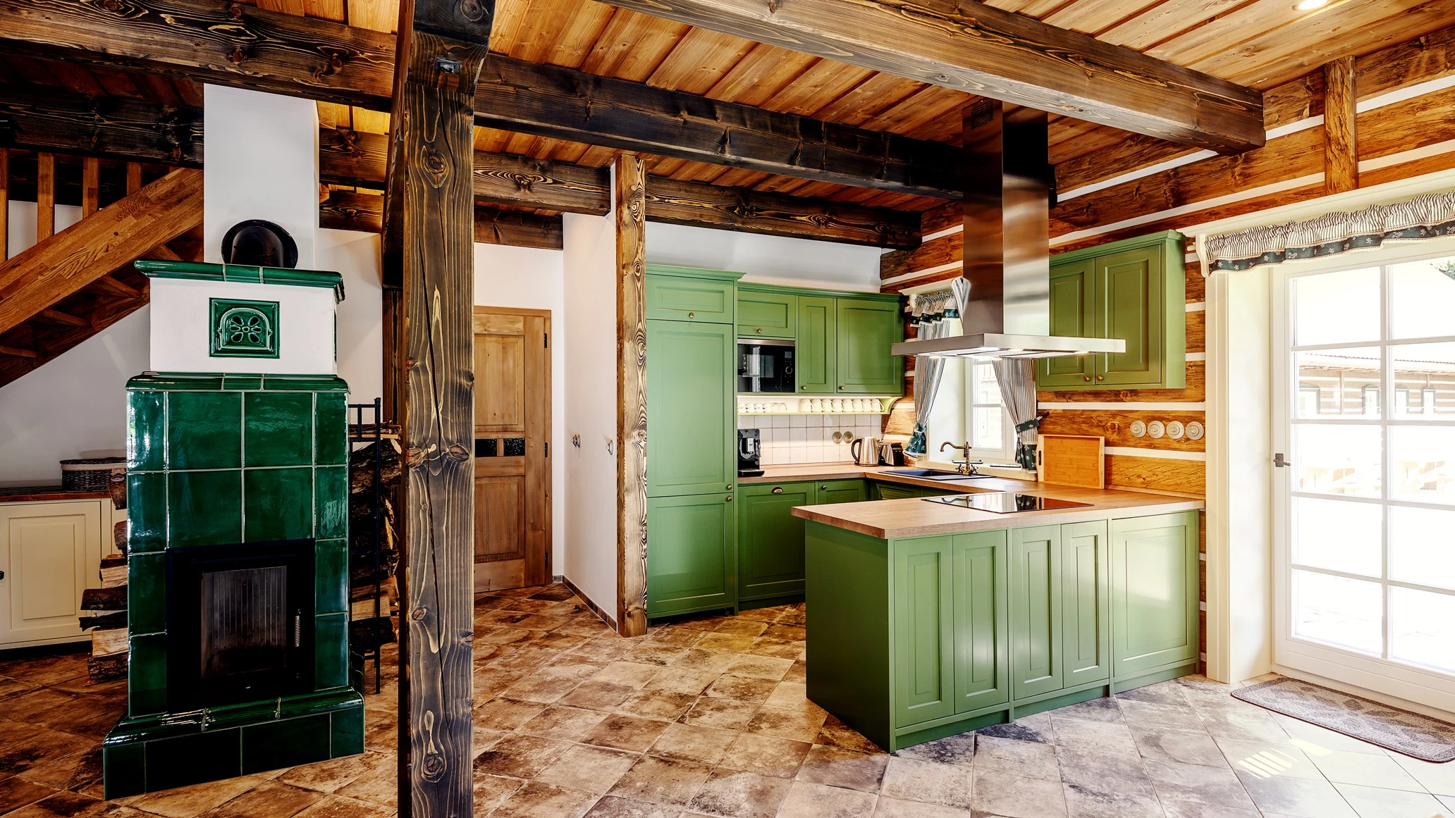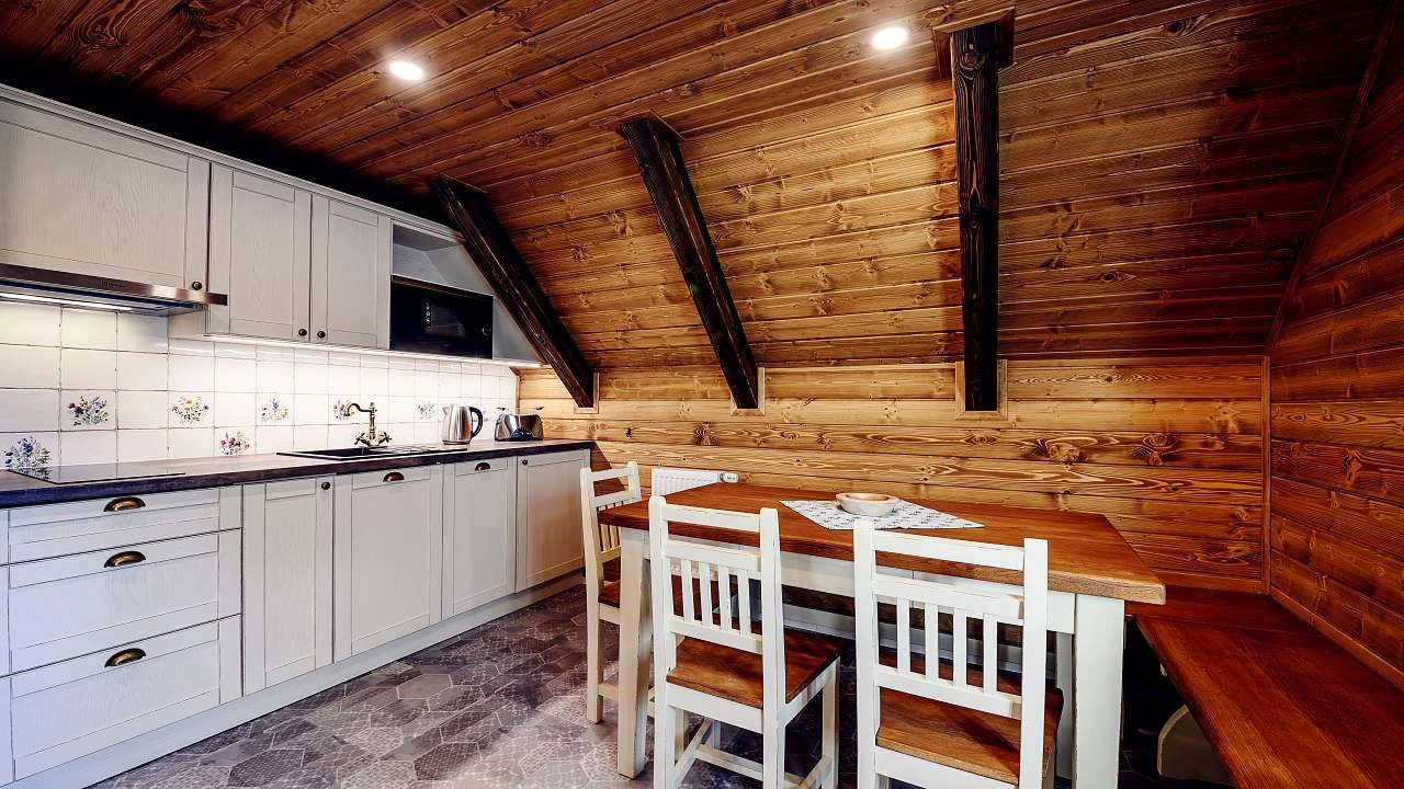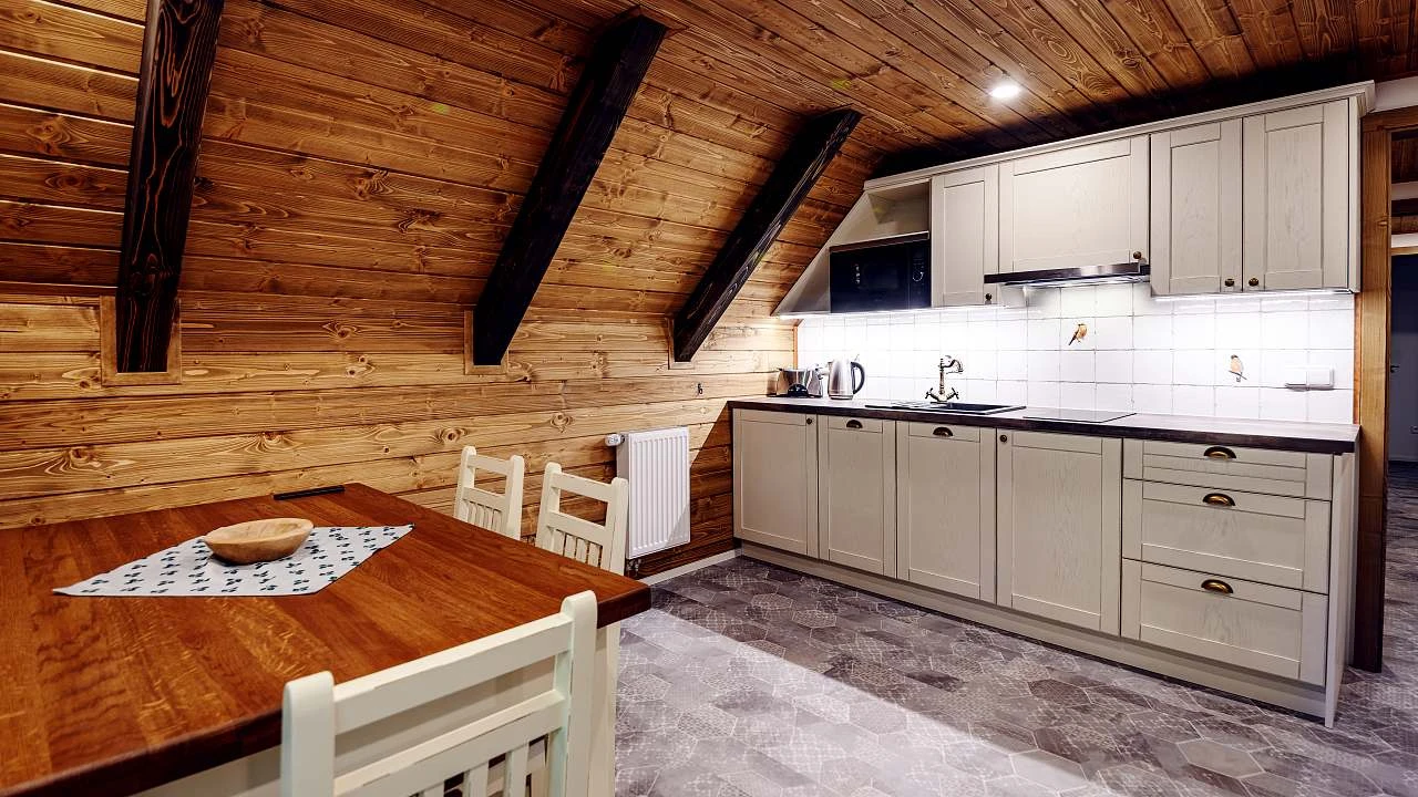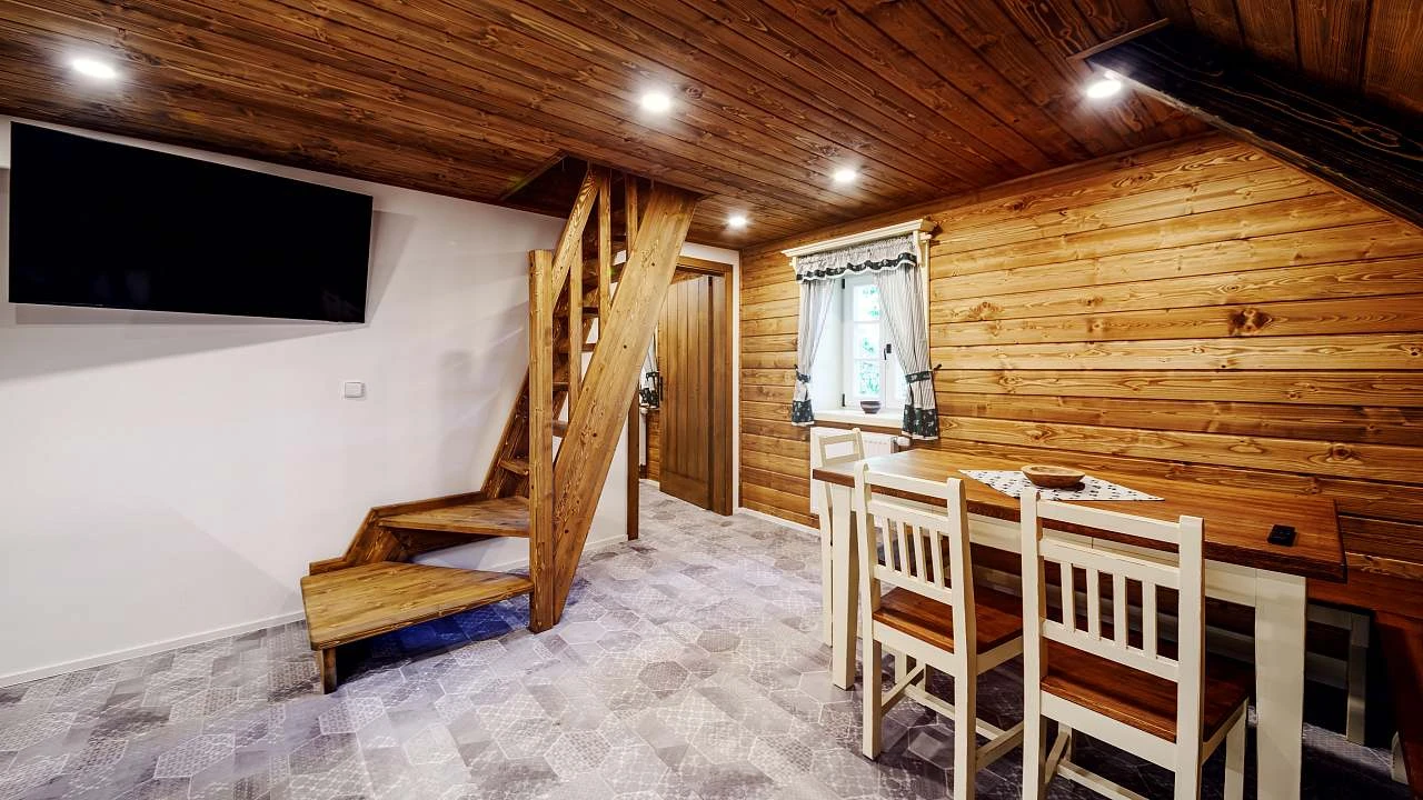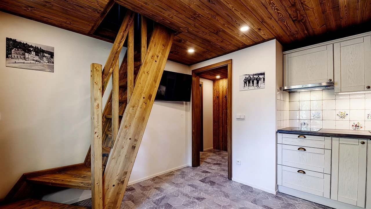 Přízemí: světnice s kachlovými kamny, jídelní stůl, rohová válecí pohovka s velkou 75″ TV, kompletně vybavená kuchyň (indukční varná deska, horkovzdušná trouba, mikrovlnka, myčka nádobí, velká lednice s mrazákem, kávovar, rychlovarná konvice atd), koupelna se sprchou a WC.