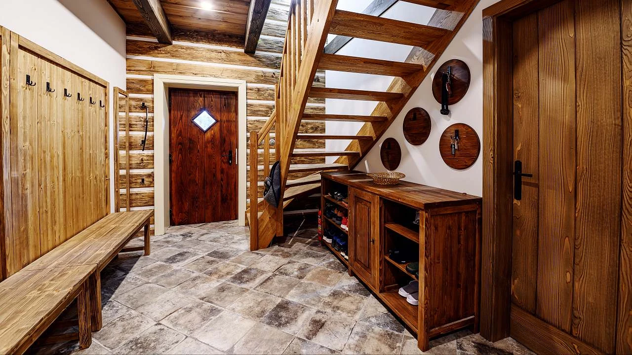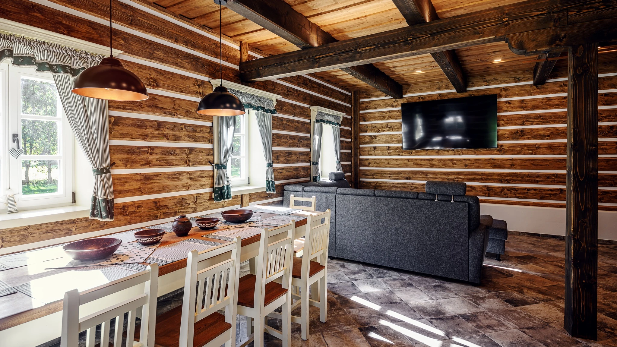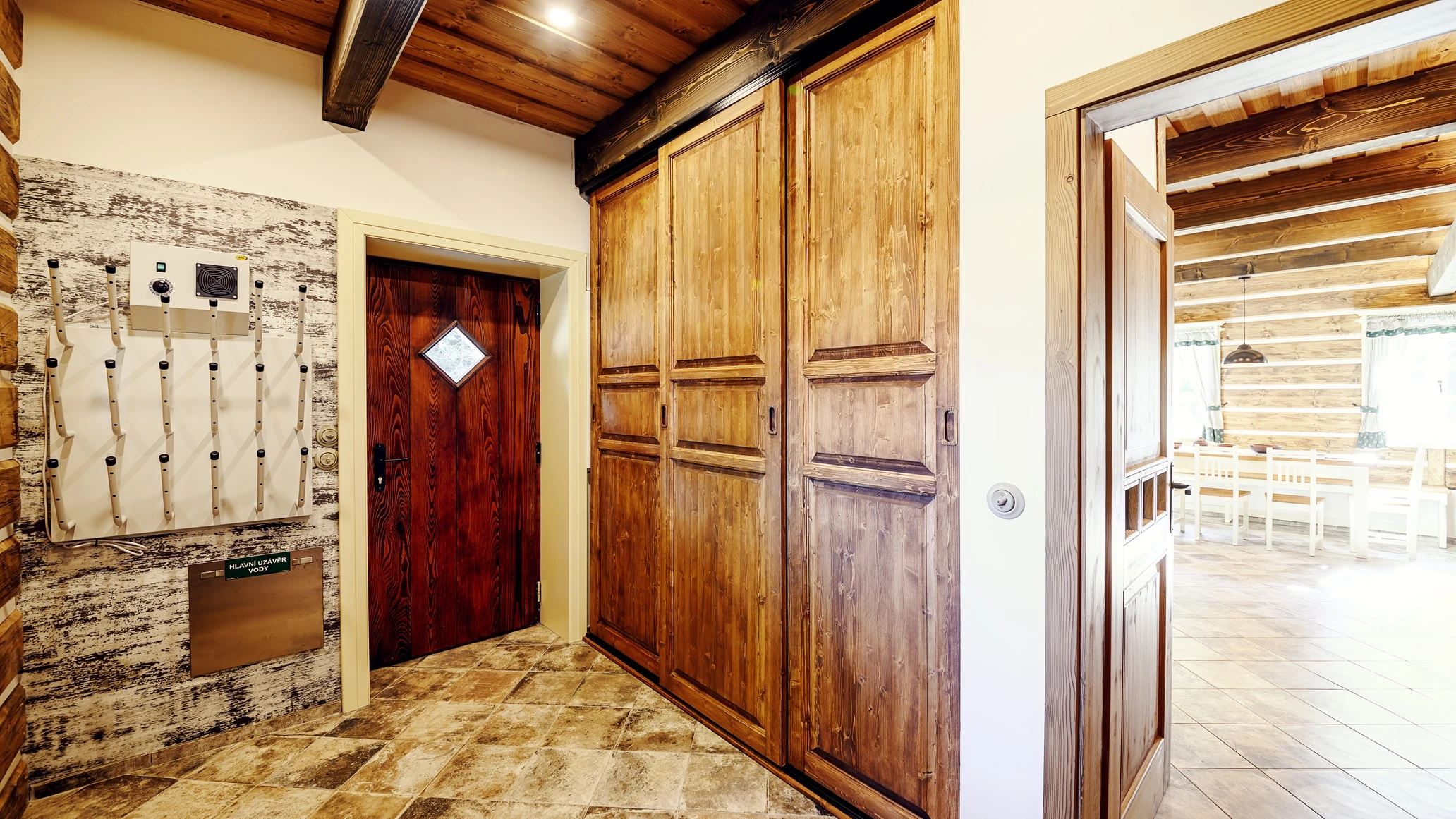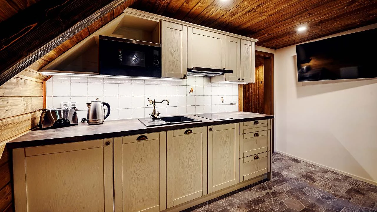 Přízemí: světnice s kachlovými kamny, jídelní stůl, rohová válecí pohovka s velkou 75″ TV, kompletně vybavená kuchyň (indukční varná deska, horkovzdušná trouba, mikrovlnka, myčka nádobí, velká lednice s mrazákem, kávovar, rychlovarná konvice atd), koupelna se sprchou a WC.