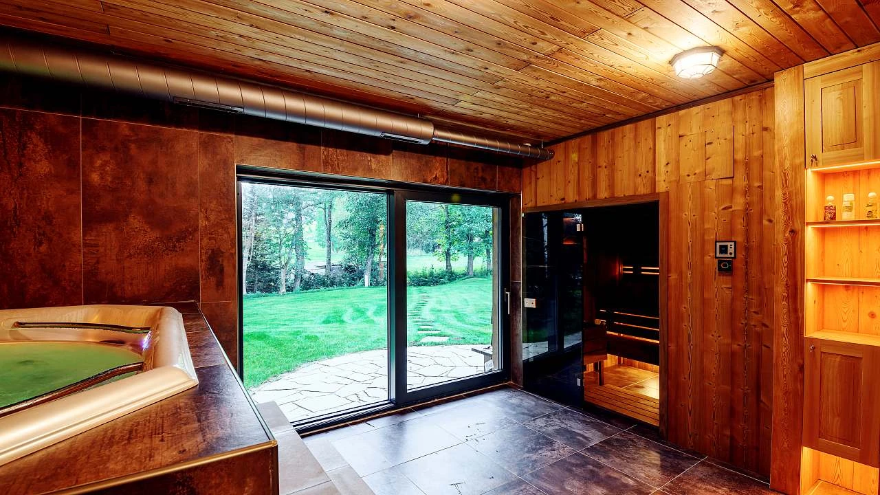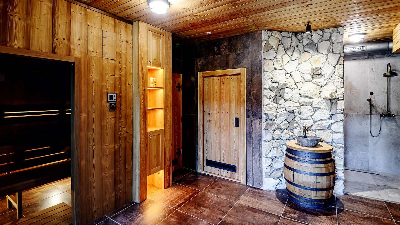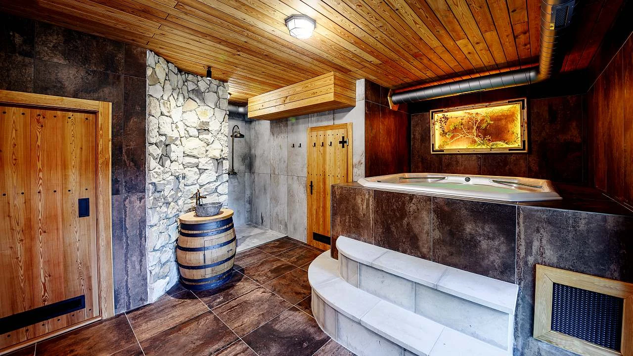 Wellness s vířivkou, saunou, sprchovým koutem a toaletou.