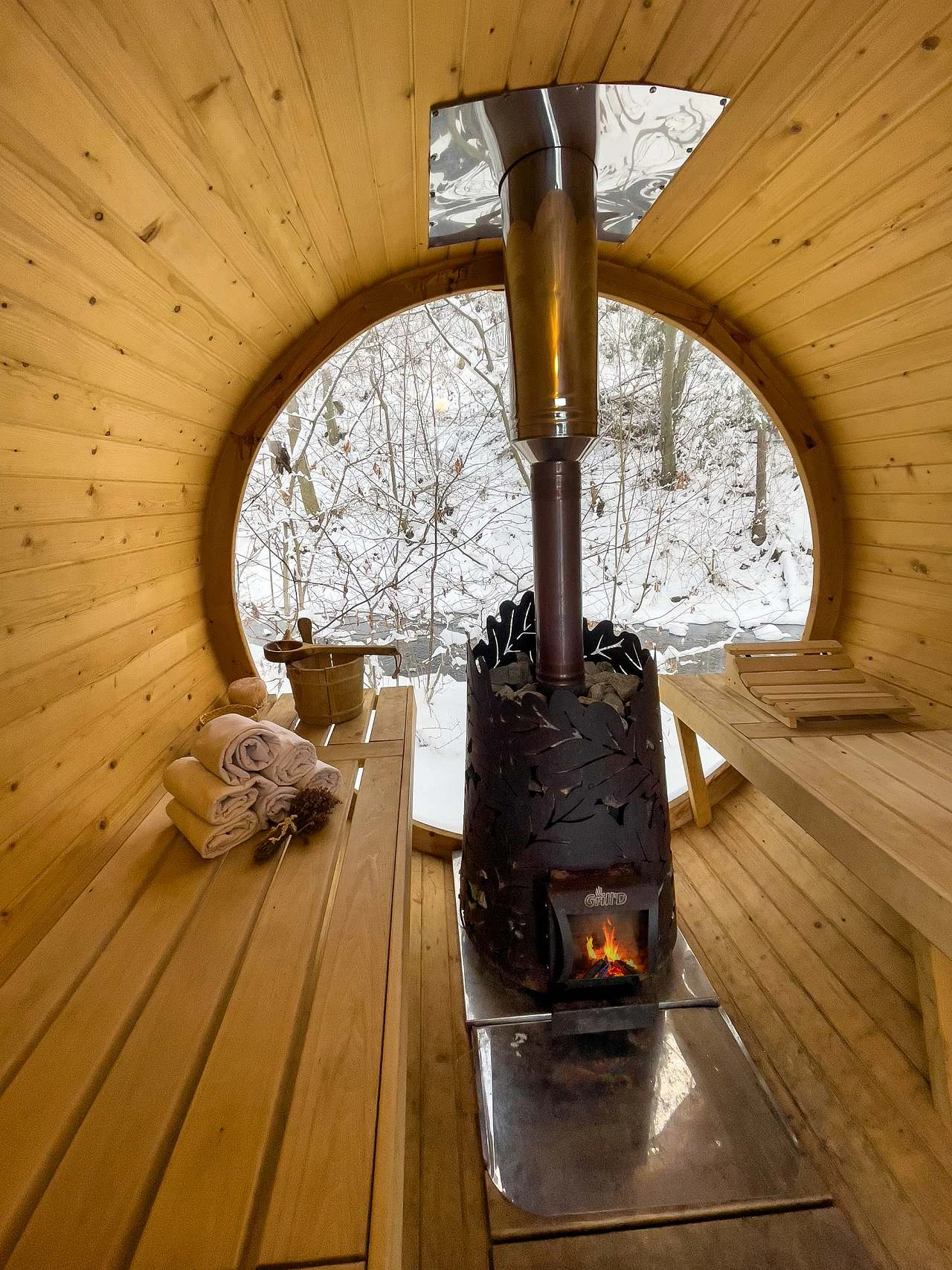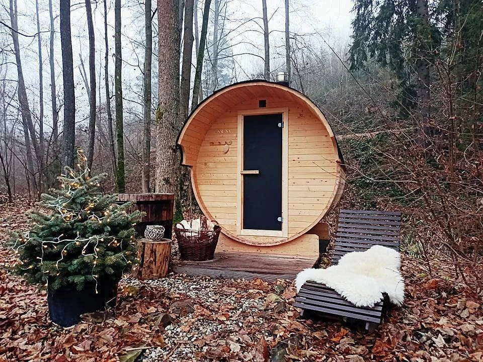- Finská sauna s kamny na dřevo (kbelík, esence, teploměr, vlhkoměr).