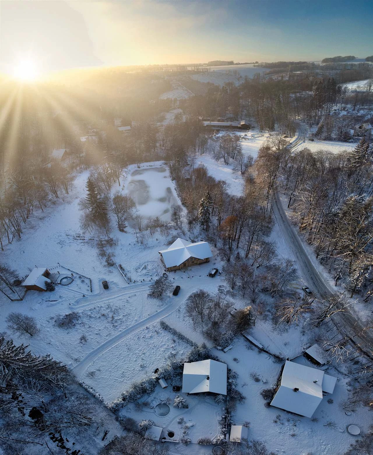 V patře jsou tři samostatné ložnice, každá s dvojlůžkem, a hlavní ložnice nabízí přistýlku ve formě domečku na spaní. Srub poskytuje WiFi připojení. Venku je posezení s grilem, bazén s molem, vířivka pro tři osoby a koupací sud pro šest osob. Finská sauna je vybavena kamny na dřevo. K dispozici jsou společenské hry, sportovní vybavení, trampolína, houpací síť, zahradní houpačka, pingpongový stůl, šipky, luk a lehátka.