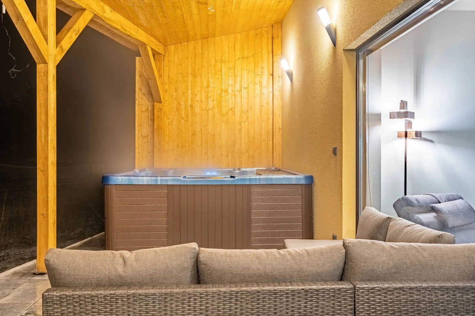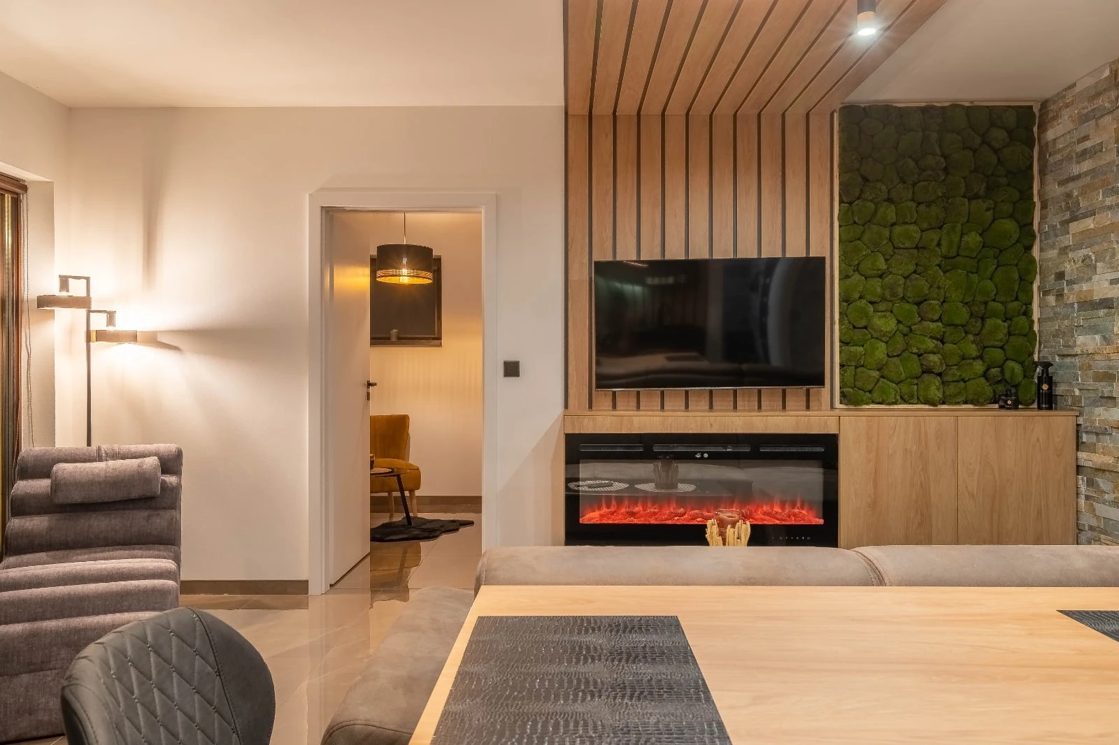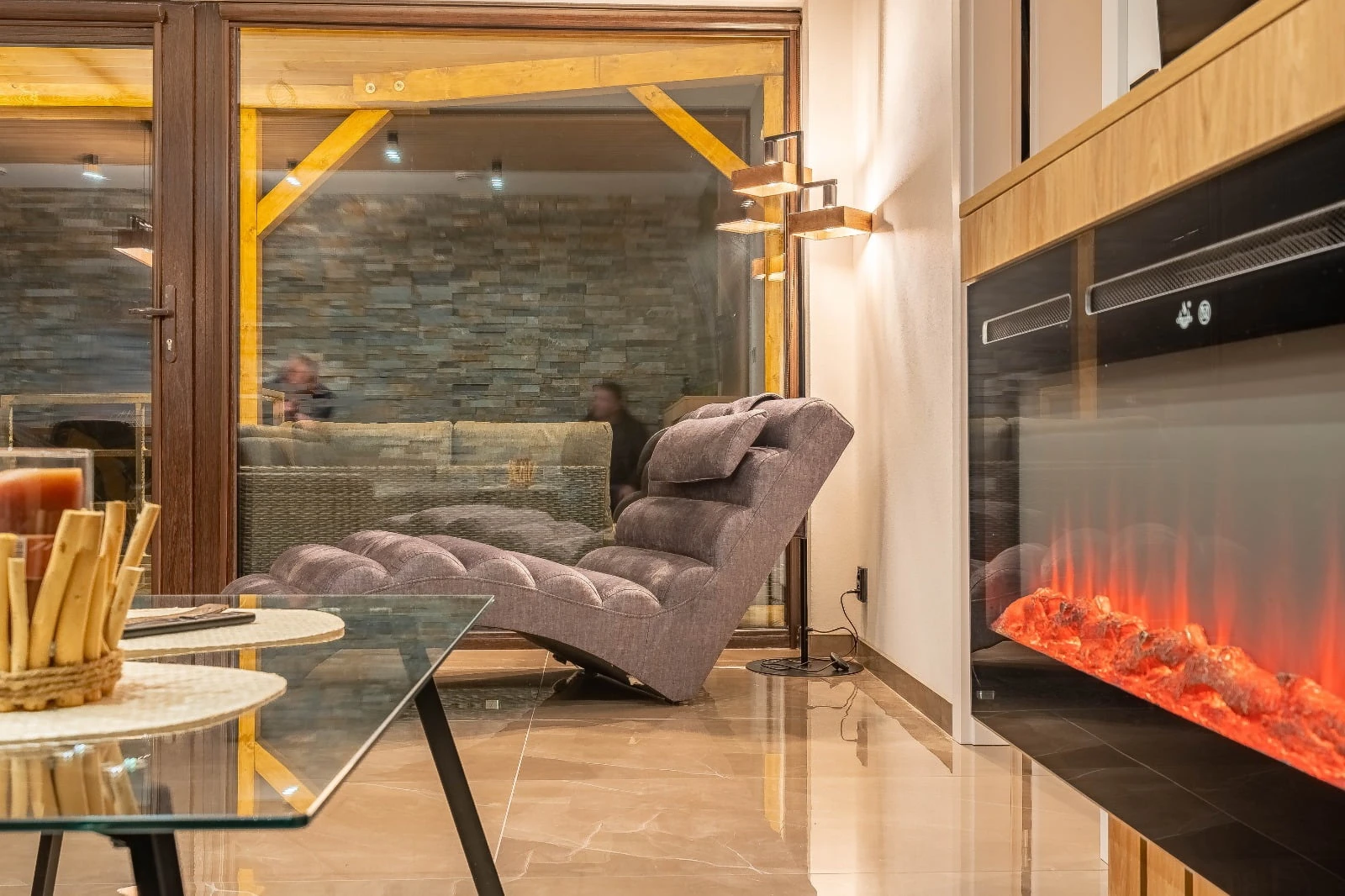 Wellness i reproduktory v celém domě lze ovládat smart systémem LOXONE, se kterým vás personál seznámí při ubytování. Ať už budete polehávat u krbu, nebo se vyhřívat v sauně či bublinkách, můžete si volný čas zpříjemnit vaší oblíbenou hudbou. Nad krbem je pak velká televize, takže se nabízí i leháro u filmu. V celém objektu je k dispozici Wi‑Fi.
