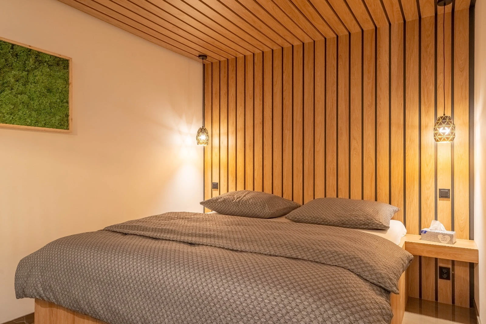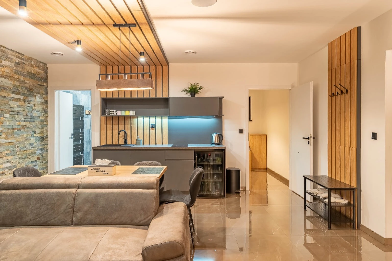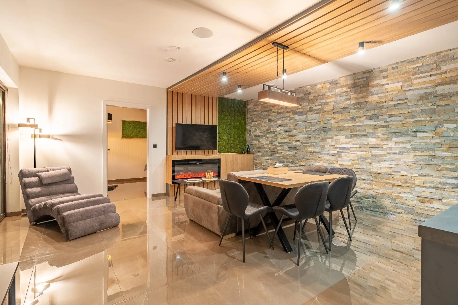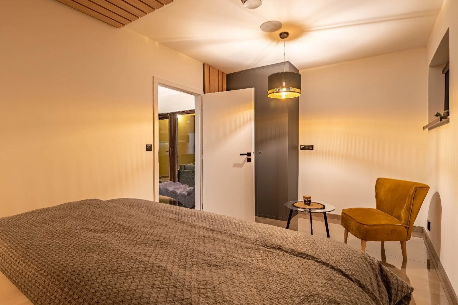 Wellness i reproduktory v celém domě lze ovládat smart systémem LOXONE, se kterým vás personál seznámí při ubytování. Ať už budete polehávat u krbu, nebo se vyhřívat v sauně či bublinkách, můžete si volný čas zpříjemnit vaší oblíbenou hudbou. Nad krbem je pak velká televize, takže se nabízí i leháro u filmu. V celém objektu je k dispozici Wi‑Fi.