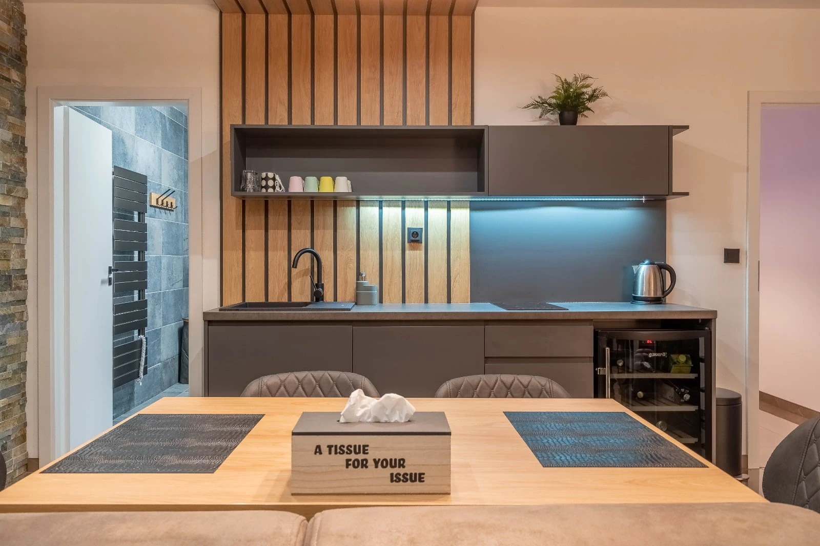 V domě najdete vše, co k pohodovému pobytu potřebujete. Ve dvou ložnicích jsou lůžka celkem pro čtyři osoby, další dvě osoby se vyspí na velké rozkládací pohovce. Součástí obýváku je i prostorná kuchyň se vším potřebným vybavením včetně vinotéky.