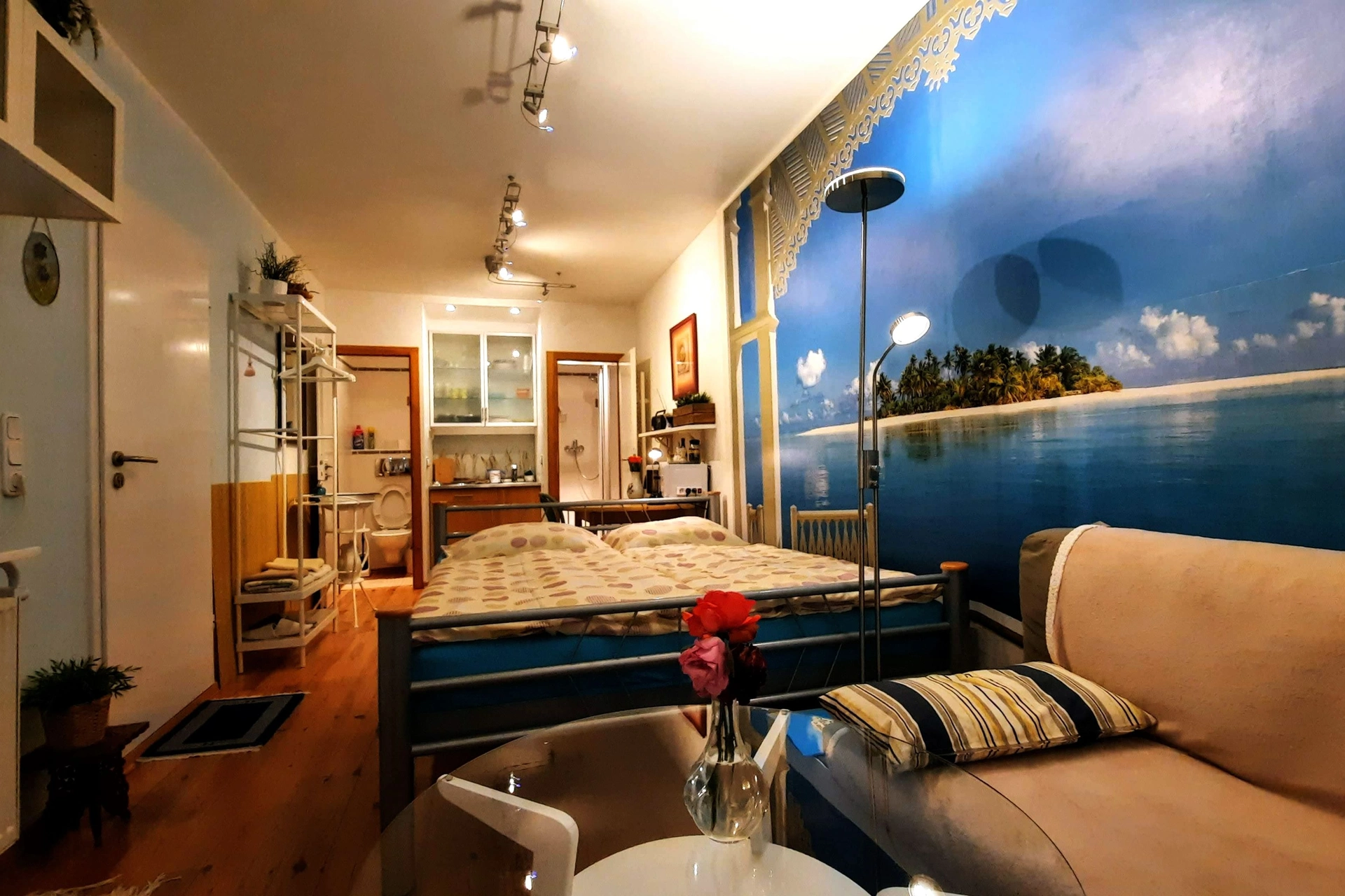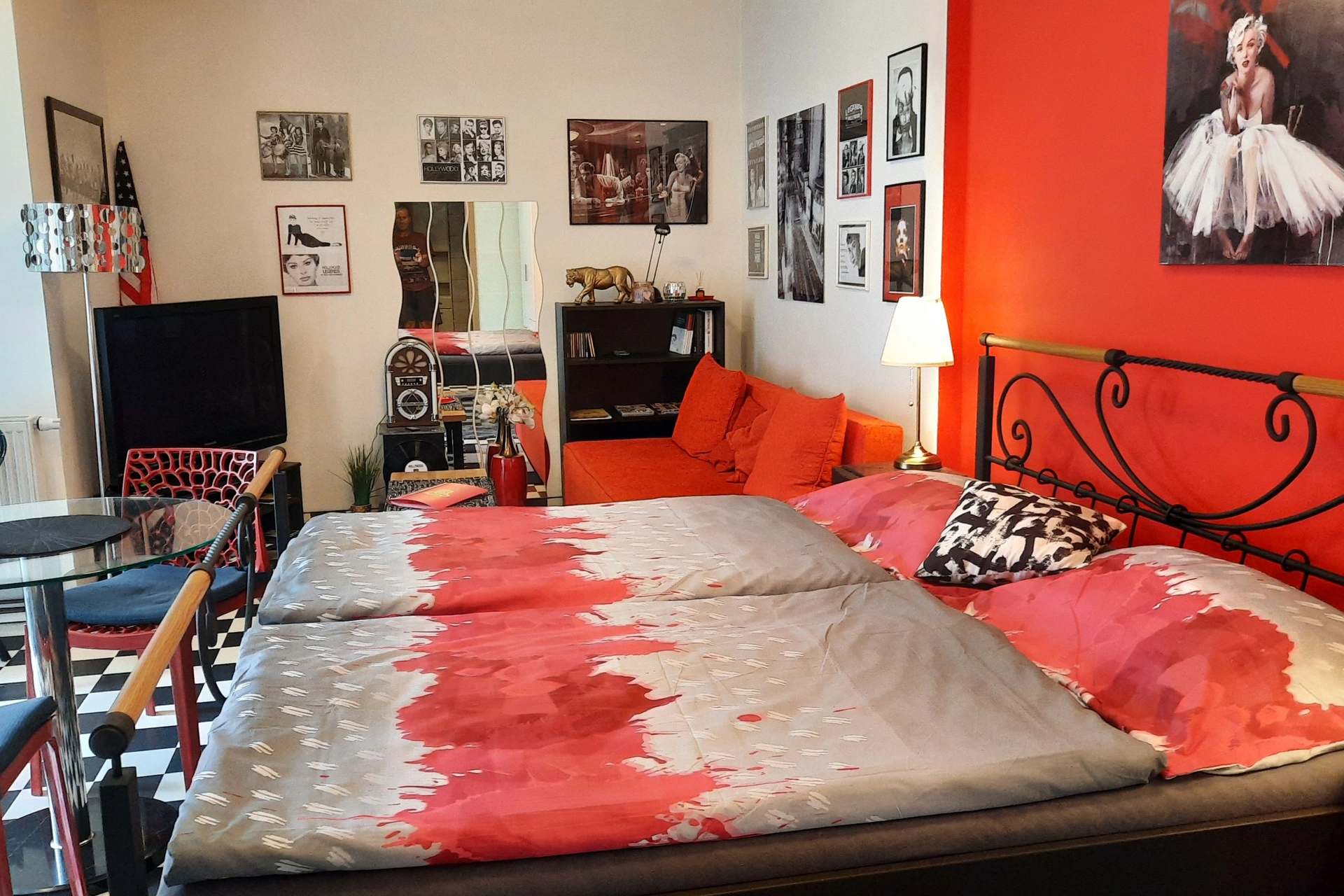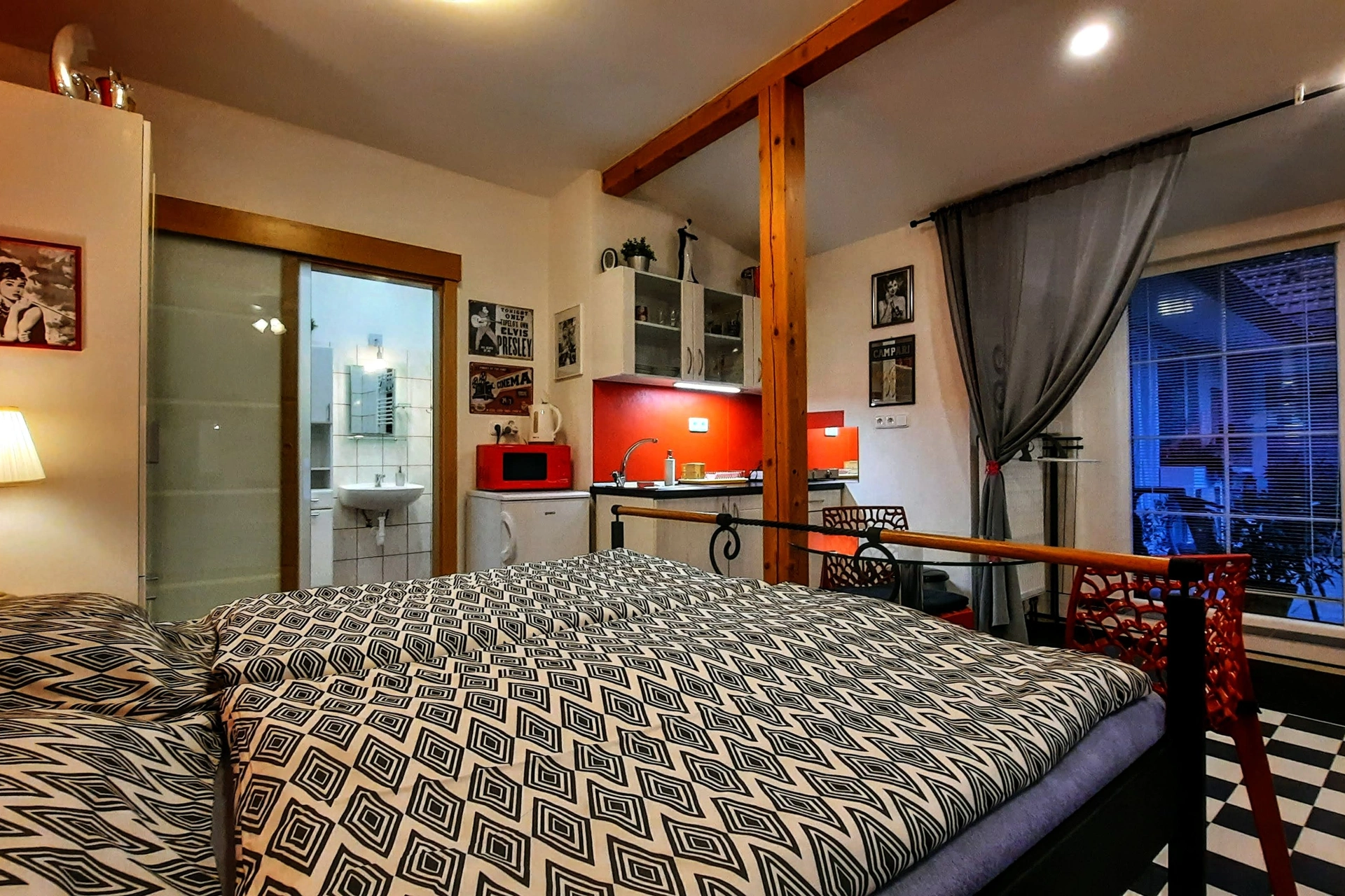 Největší apartmán v objektuVybaven TV plazma a stylovým jukeboxem s BluetoothWiFi k dispoziciKuchyňka s základním vybavenímSprchaManželská postel a rozkládací pohovkaPřímý výstup na zahradní terasyMožnost posezení v atriu