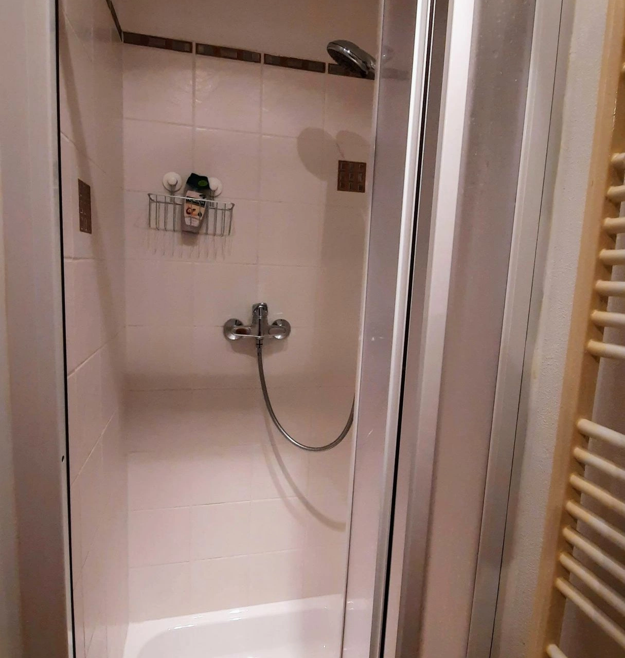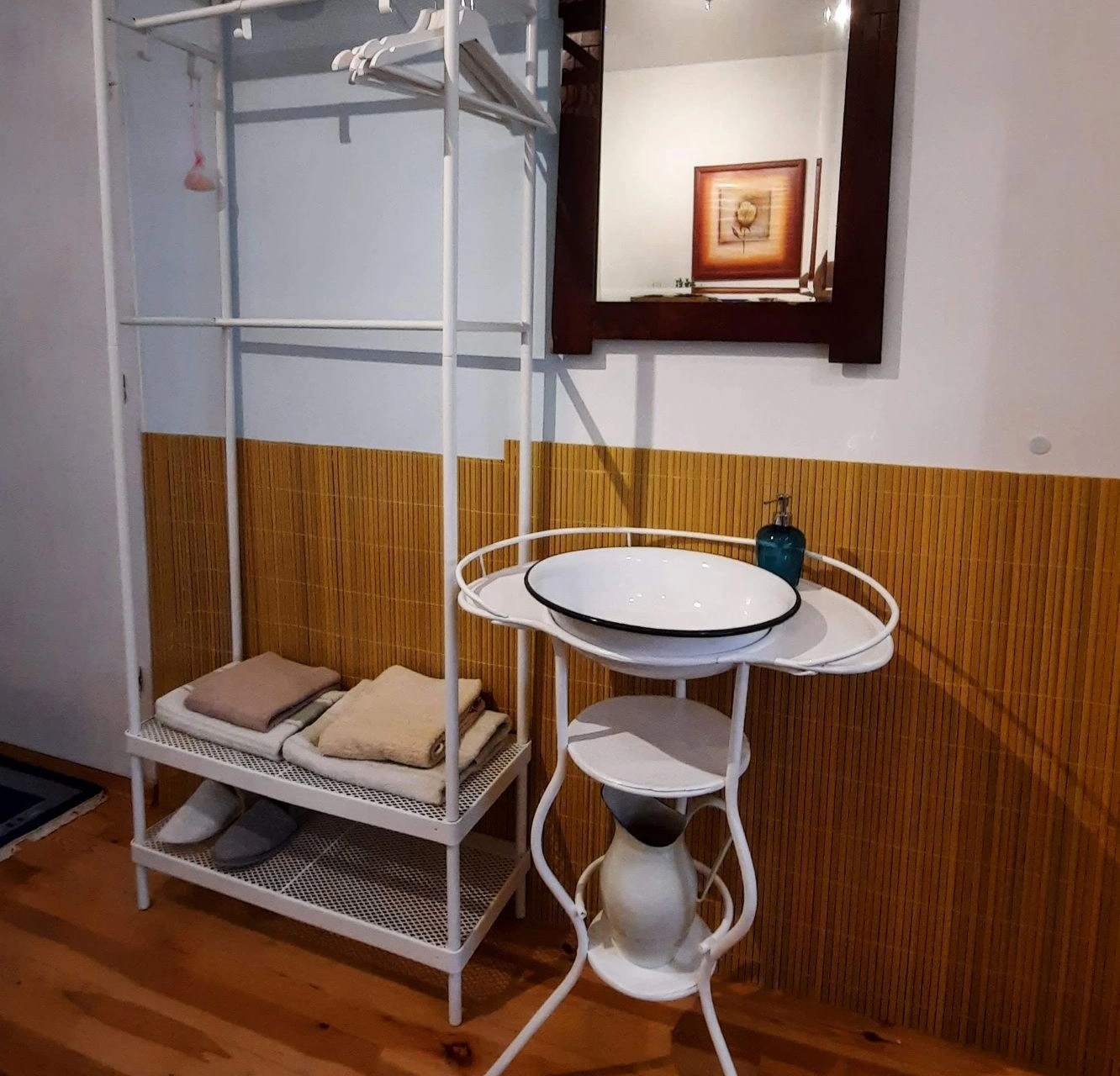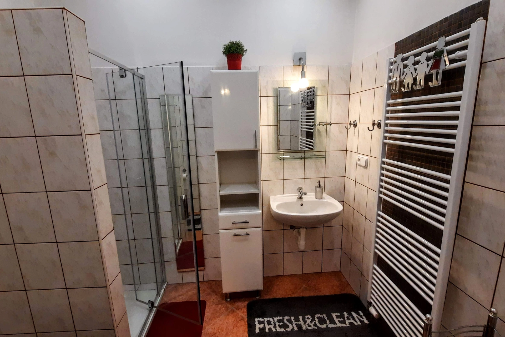 - V místnosti starší umyvadlo se džbánem, tekoucí pitná a teplá voda dostupná ve sprše a kuchyni