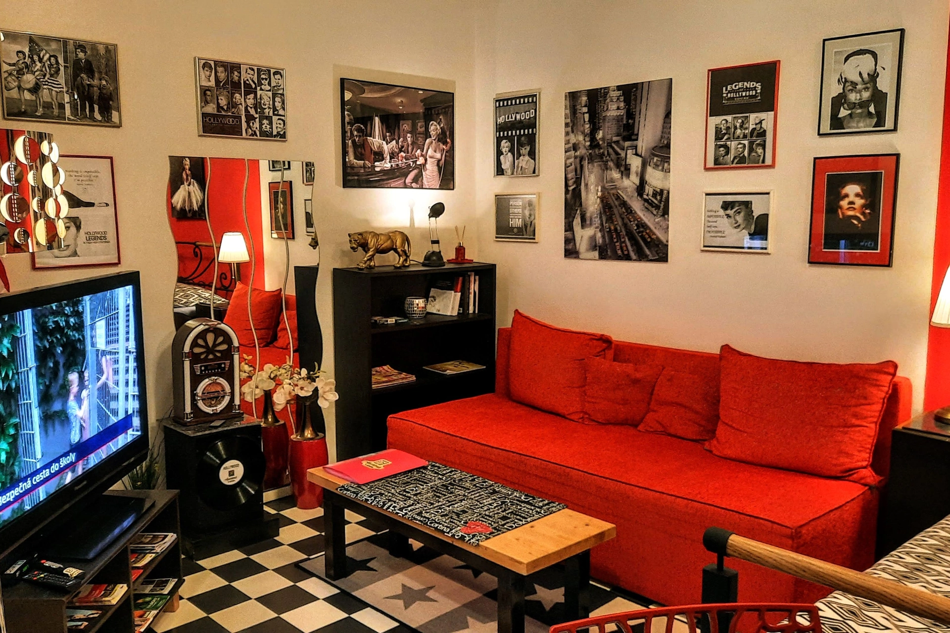 - Apartmán HOLLYWOOD – 1. patro, 28 m², manželská postel + rozkládací pohovka, kuchyňka, TV, jukebox s Bluetooth, WiFi, sprcha, přístup na terasu a atrium.