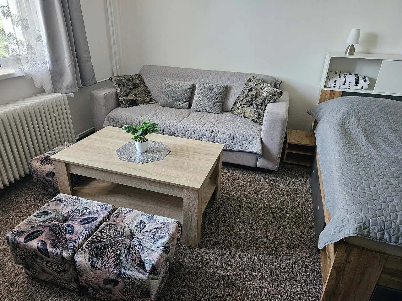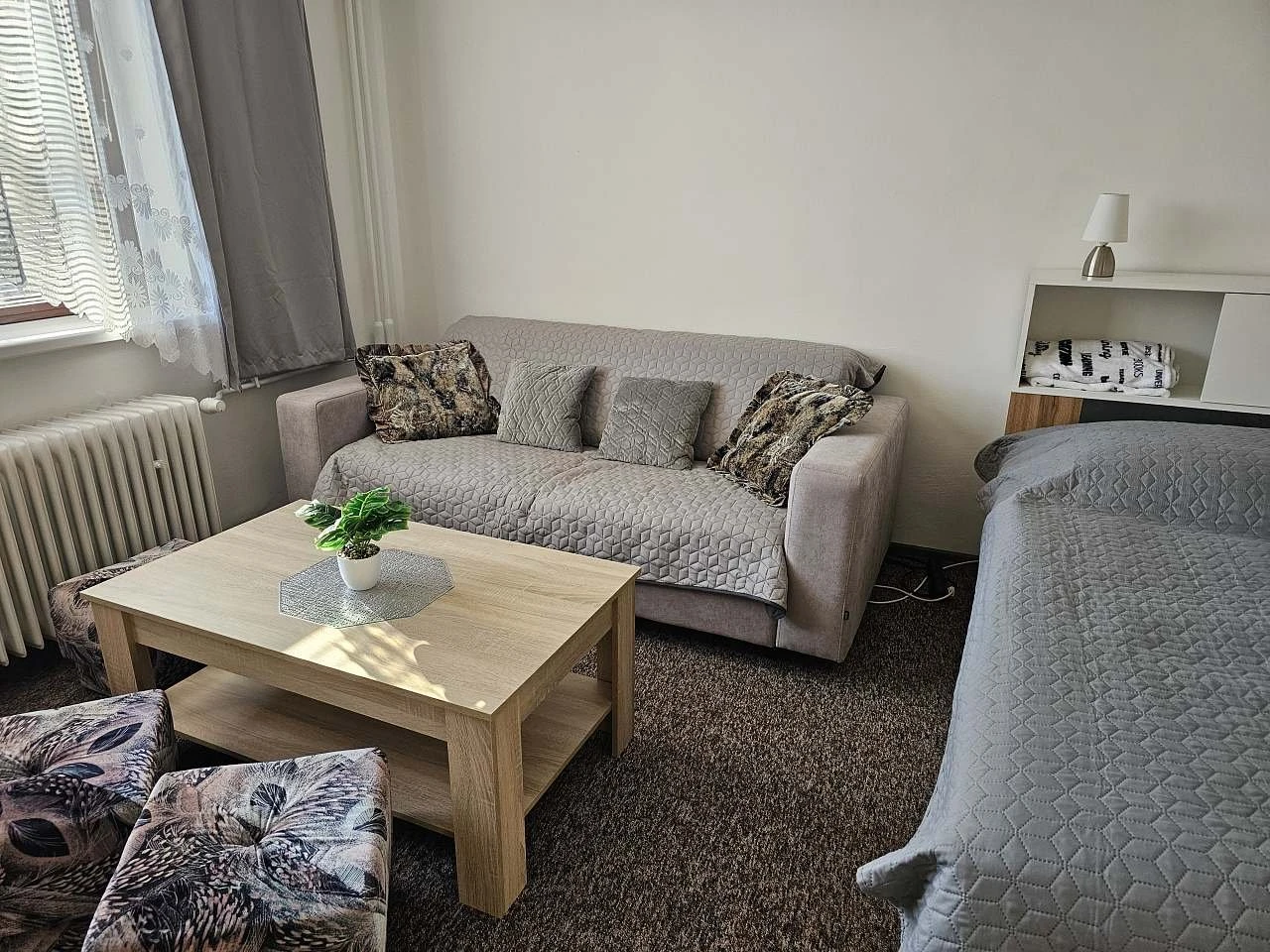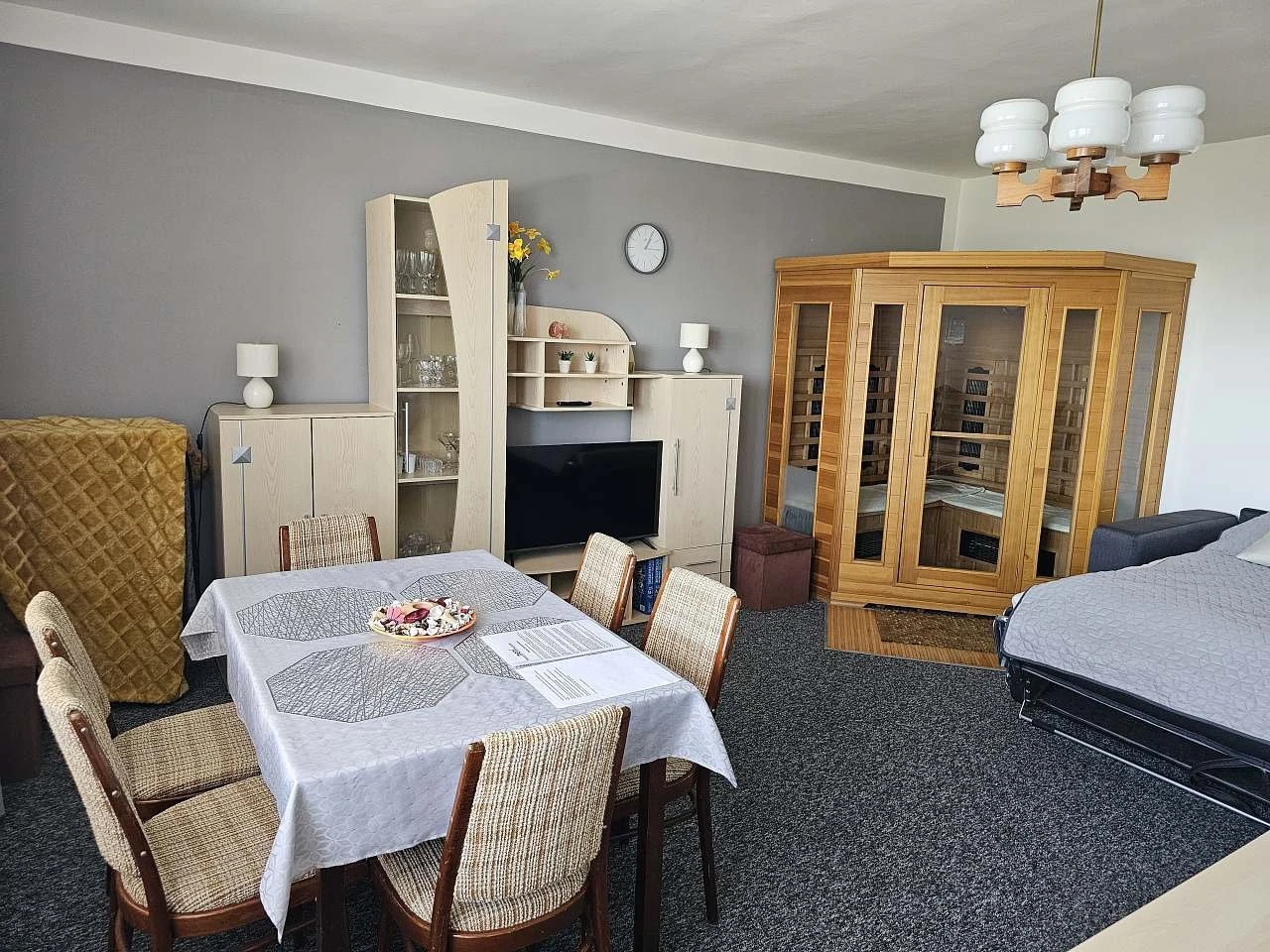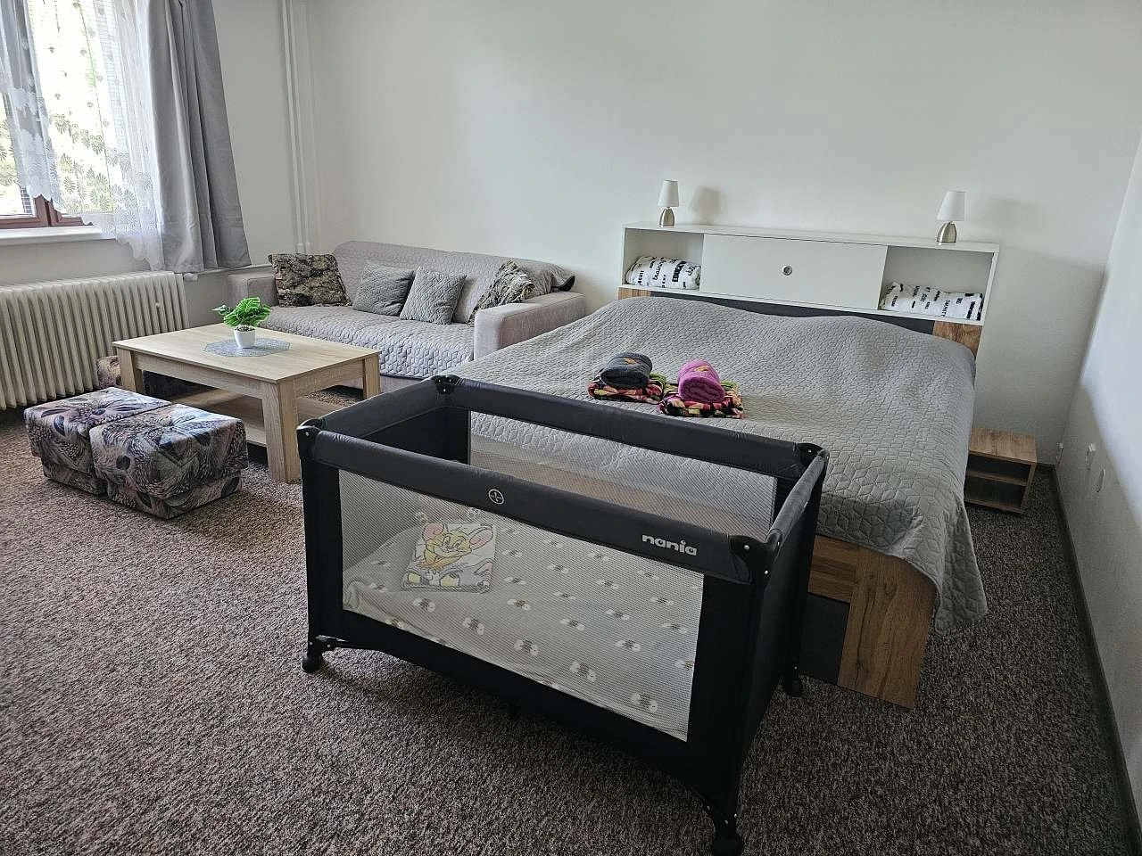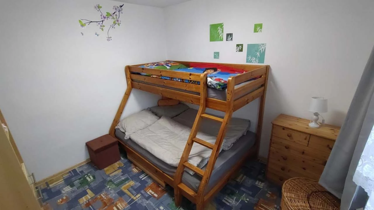 - 1. ložnice – velká manželská postel, rozkládací pohovka, dětská postýlka, TV.