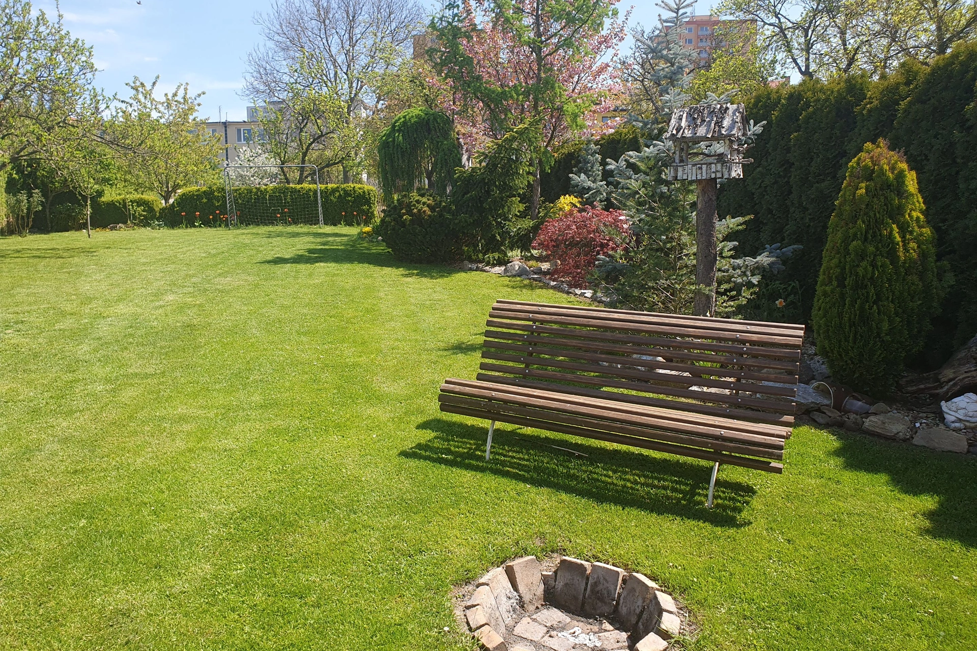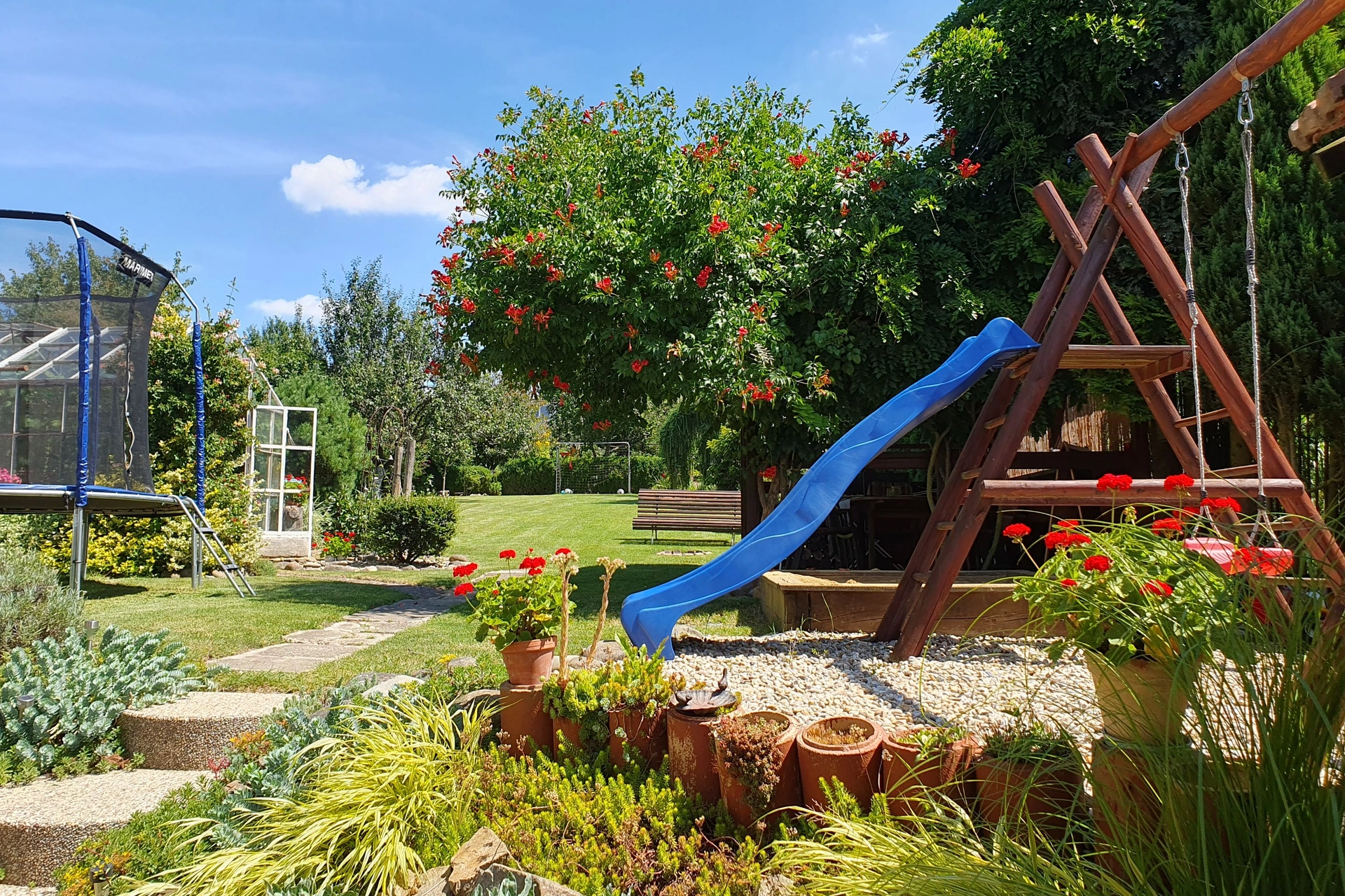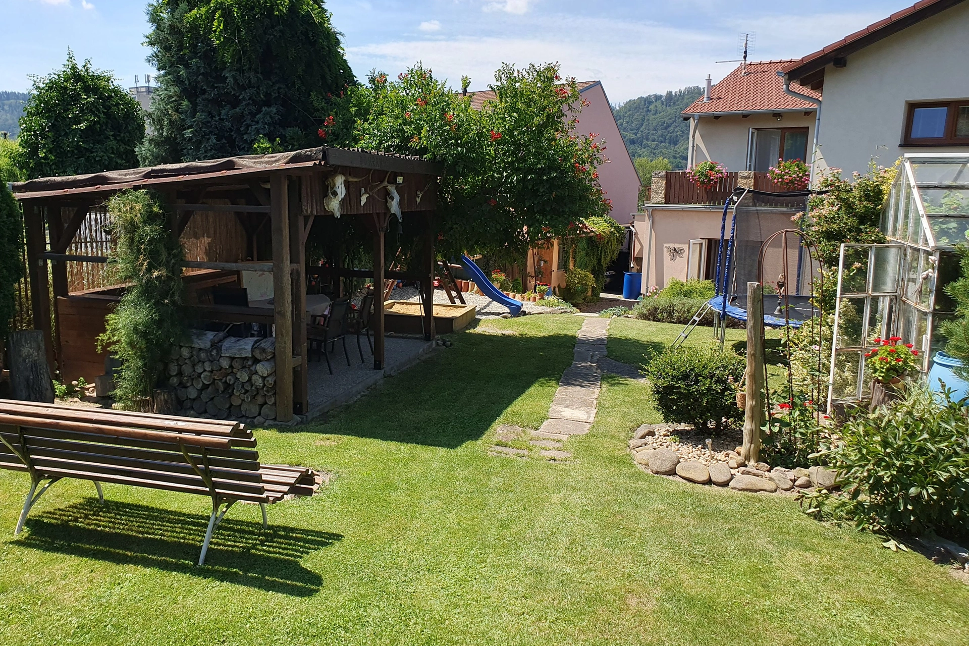 Za domem se nachází rozsáhlá zahrada s pergolou, možností posezení, ohniště a zapůjčení grilu. Pro děti je k dispozici pískoviště, houpačky, fotbalová branka, trampolína a velký travnatý prostor na hraní, včetně dětských hraček. Kola lze uschovat na dvoře, parkování je možné přímo před domem s výhledem z oken apartmánu. V ceně ubytování je zahrnuto ložní prádlo, ručníky, utěrky, základní hygienické a čisticí prostředky, Wi-Fi v celém objektu, závěrečný úklid i místní poplatek městu. Ubytování není umožněno s domácími mazlíčky.