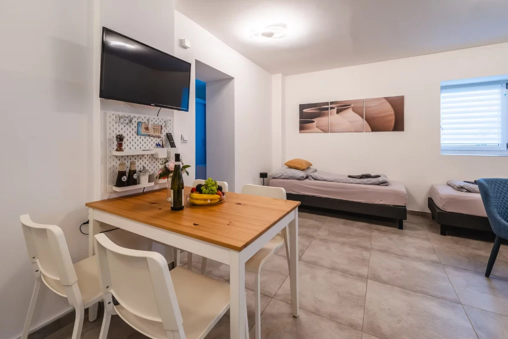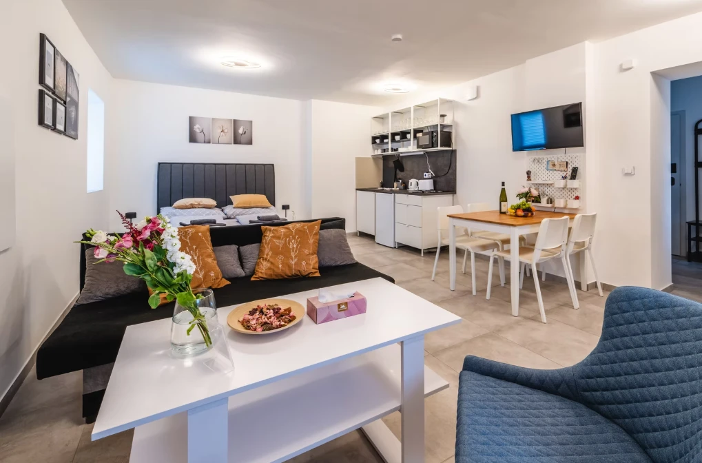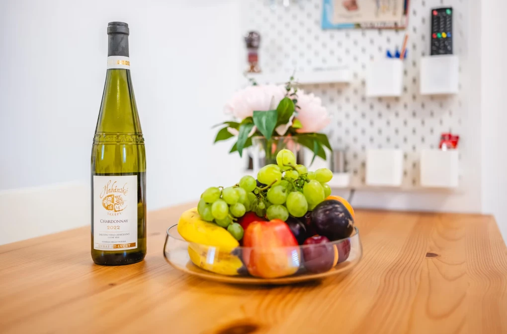 K vybavení apartmánu patří plně vybavený kuchyňský kout s indukční deskou, lednicí, mikrovlnnou troubou, rychlovarnou konvicí, topinkovačem, tyčovým mixérem a kávovarem Krups Nespresso. Součástí jsou také sprchový kout, WC, fén, ručníky, osušky, podlahové topení a sítě proti hmyzu. Apartmán nabízí TV s HDMI, jídelní stůl se 6 židlemi, velkou šatní skříň, komodu, botník, věšák, konferenční stolek, vysavač, žehličku a žehlící prkno.