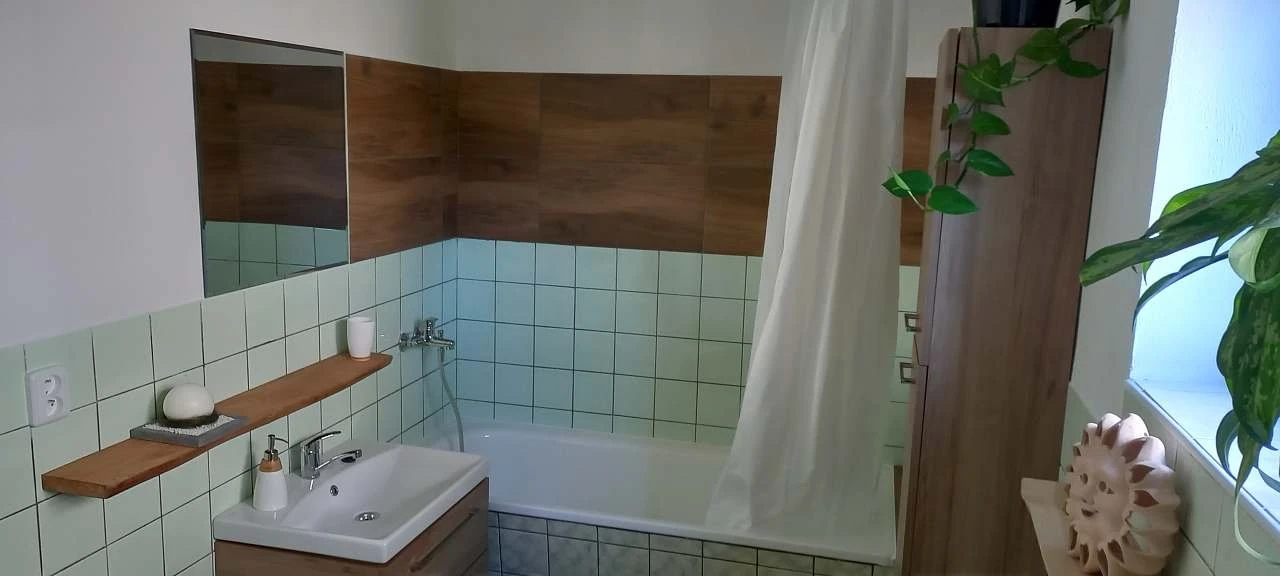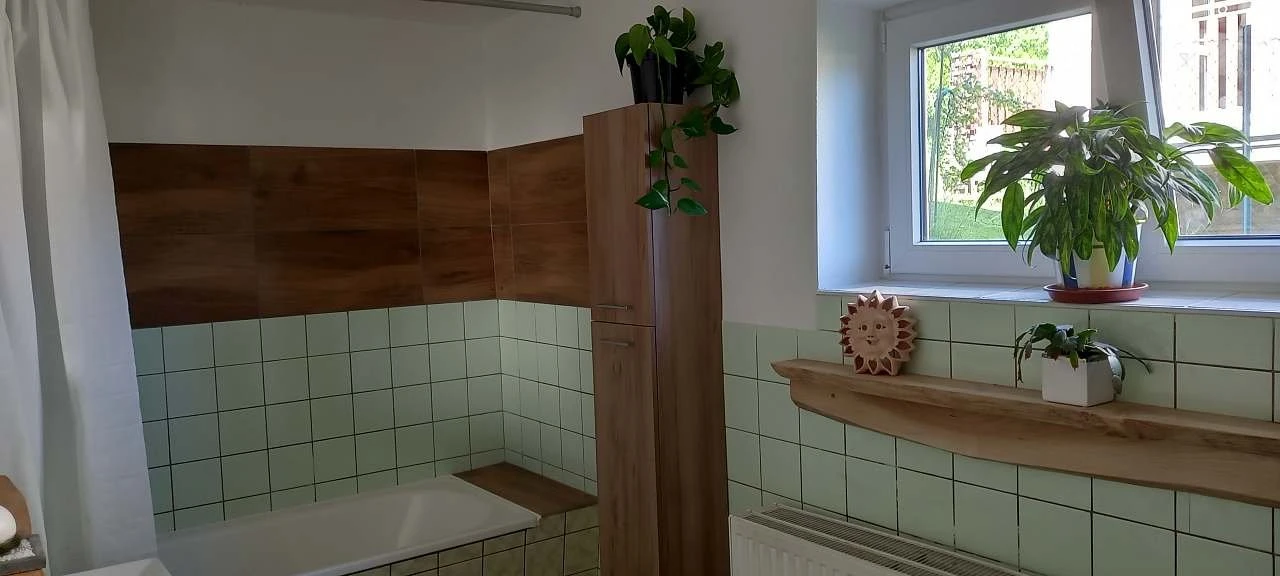 Sociální zařízení obsahuje koupelnu s vanou, umyvadlem a WC.