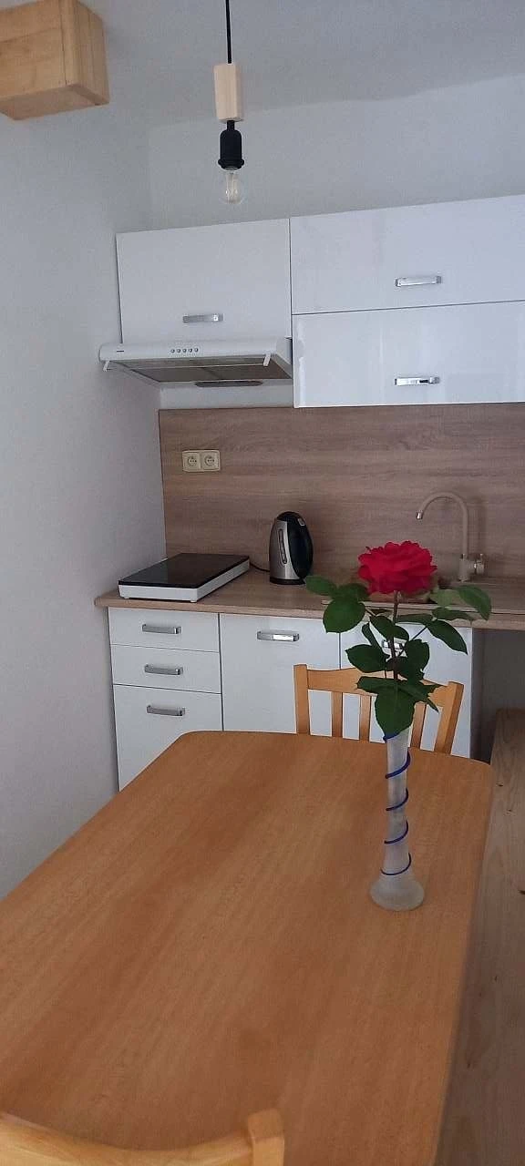 Kuchyň: kompletně vybavená, obsahuje nádobí, indukční vařič, rychlovarnou konvici, lednici a mikrovlnnou troubu.