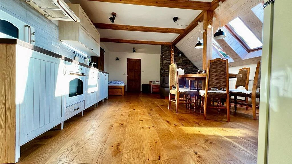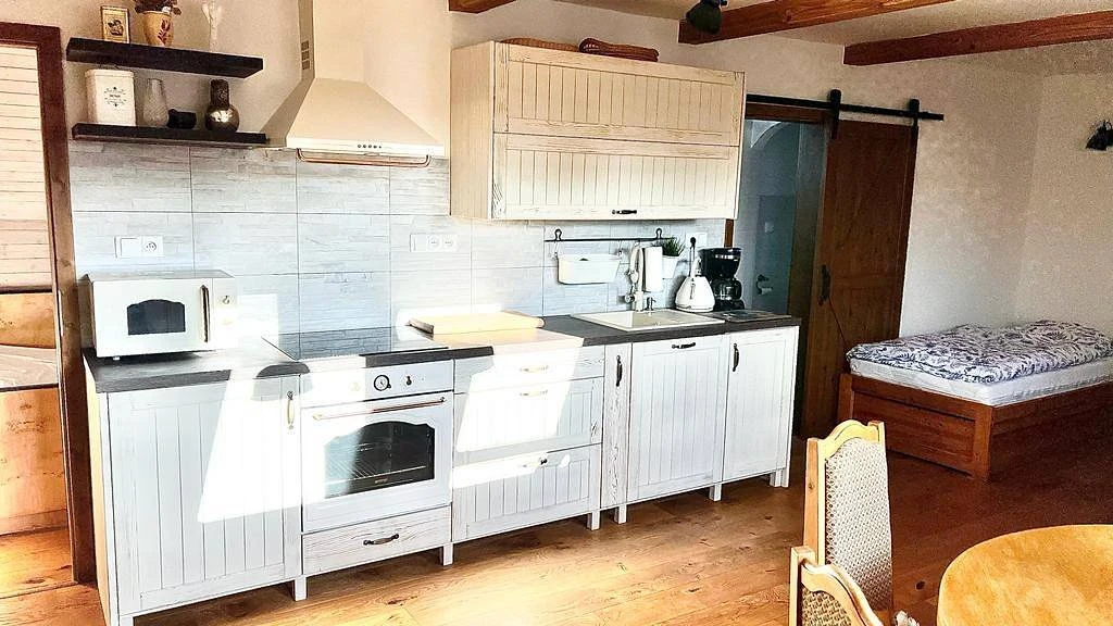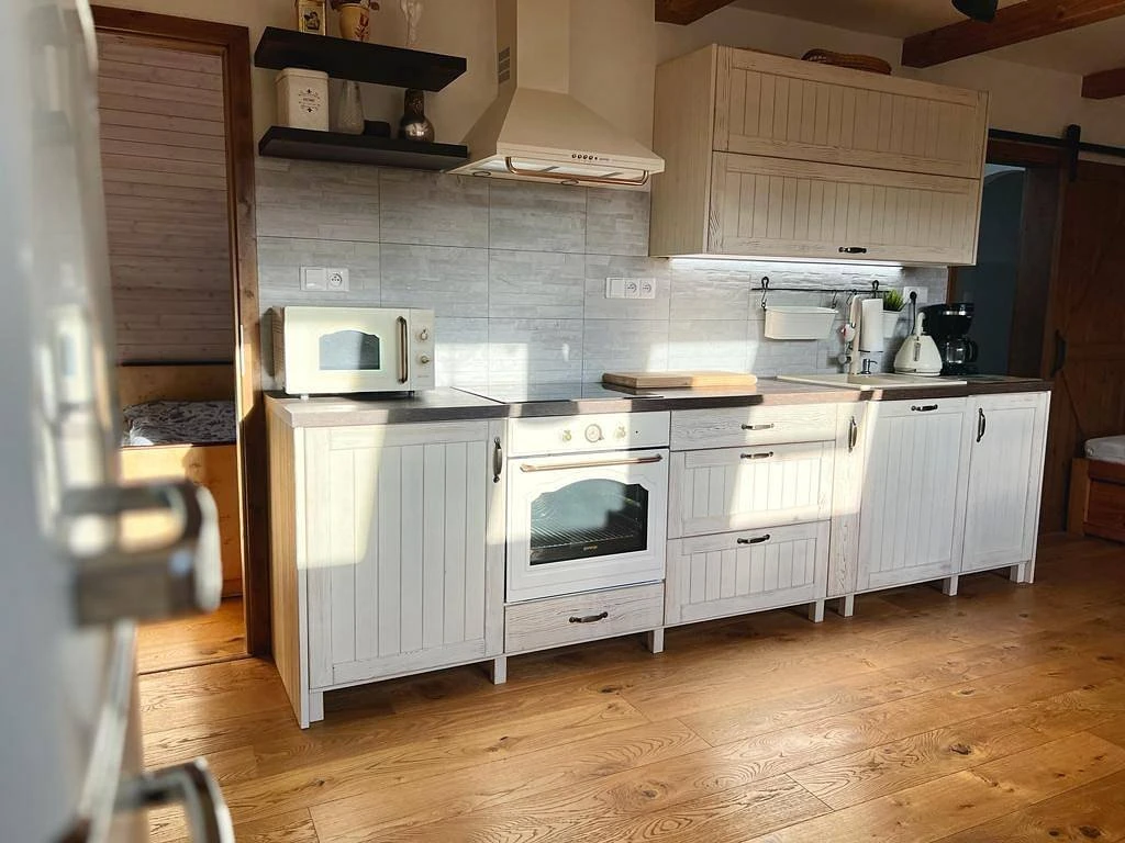 - Plně vybavená kuchyňská linka se sporákem, troubou a lednicí