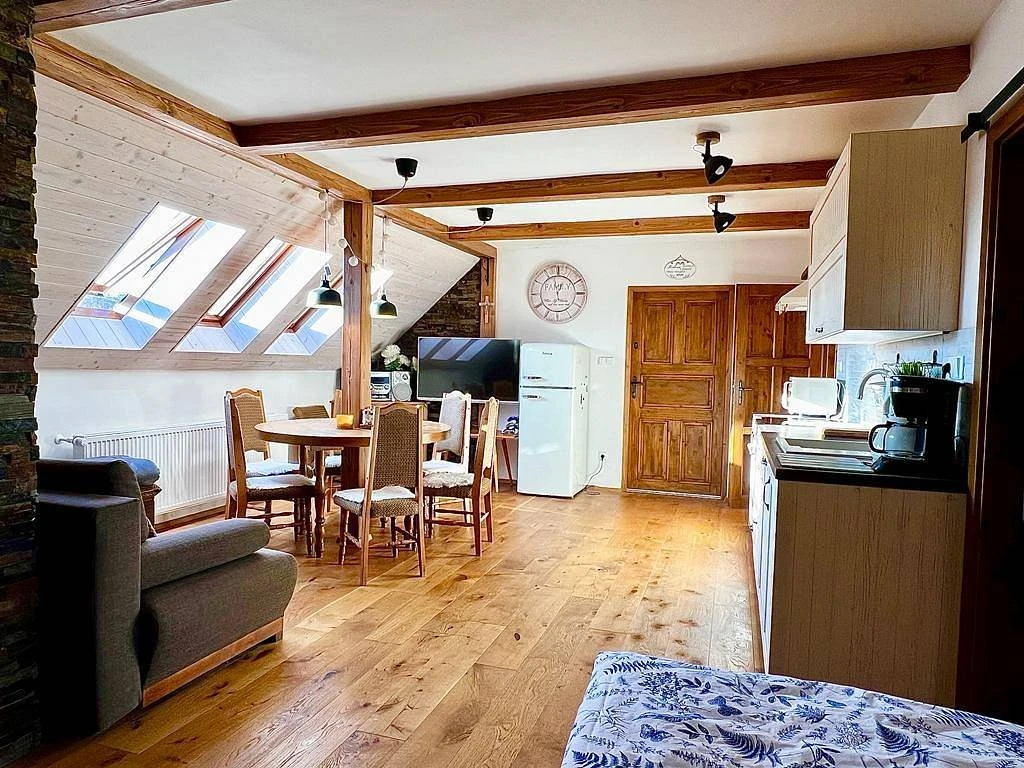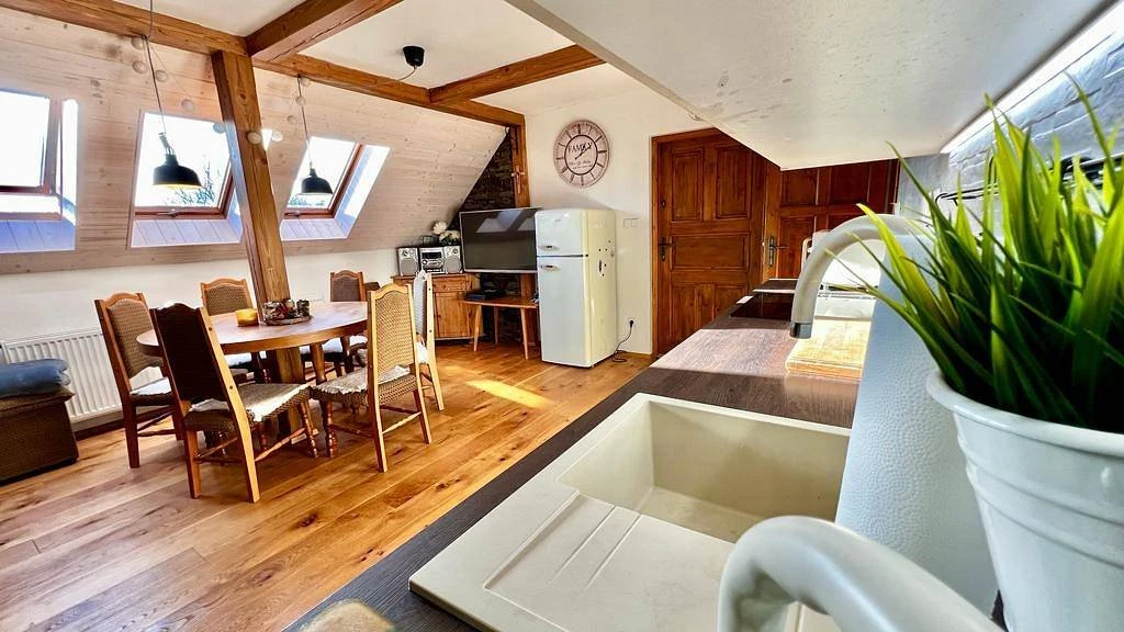 Apartmán Křídla se nachází v podkroví rodinného domu na okraji obce, v blízkosti lesa. Kapacita ubytování je 6 osob – samostatná ložnice s manželskou postelí, v hlavním prostoru jsou 2 jednolůžkové postele a rozkládací gauč pro 2 osoby. Součástí apartmánu je koupelna se sprchovým koutem a WC, plně vybavená kuchyň, jídelní stůl, TV a Wi‑Fi. Apartmán má vlastní vchod a oddělenou chodbu s úložným prostorem pro věci, kočárek, kola nebo lyže. Venkovní prostor nabízí přístřešek s posezením a zahradní gril. Parkování je možné přímo u domu pod střechou pro 2 vozidla.