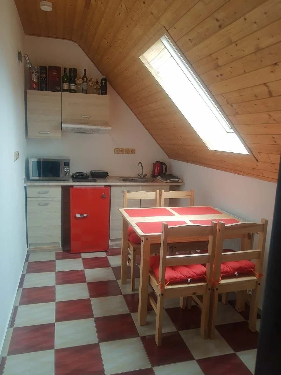Apartmán je k dispozici celoročně kromě Silvestra a je určen pro maximálně 4 osoby. Obsahuje obývací část s pohovkou a televizí, propojenou s kuchyní. Kuchyň je vybavena elektrickou troubou, elektrickým vařičem, mikrovlnnou troubou, rychlovarnou konvicí, lednicí, toustovačem a jídelním sezením. Ložnice má dvě samostatné postele s možností přistýlek ve formě matrací.