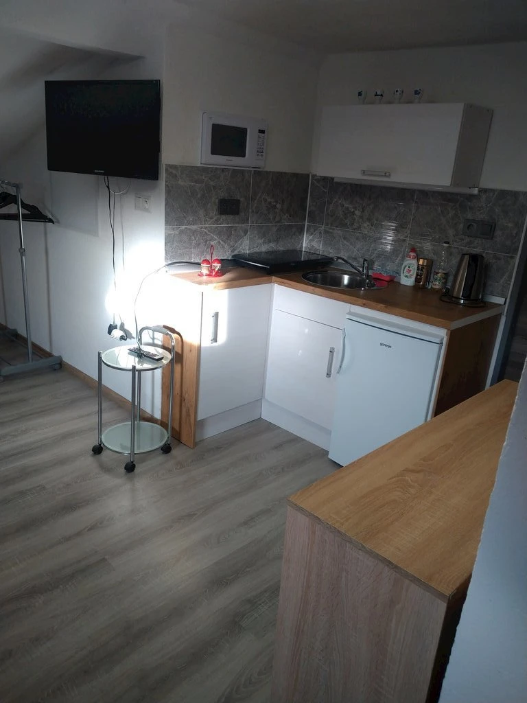 - Obývací prostor a kuchyň: kuchyňský kout s mikrovlnnou troubou, indukční varnou deskou, ledničkou, rychlovarnou konvicí, topinkovačem a toustovačem; televize