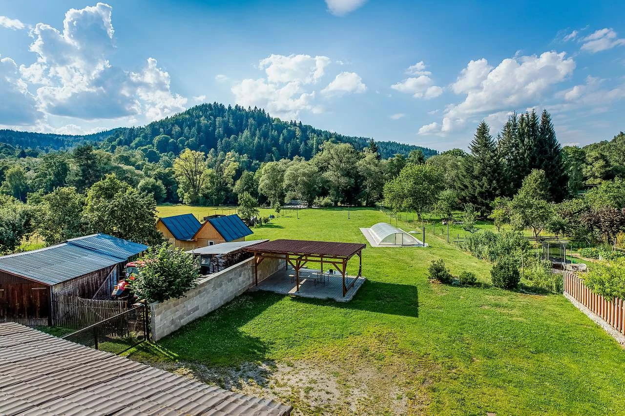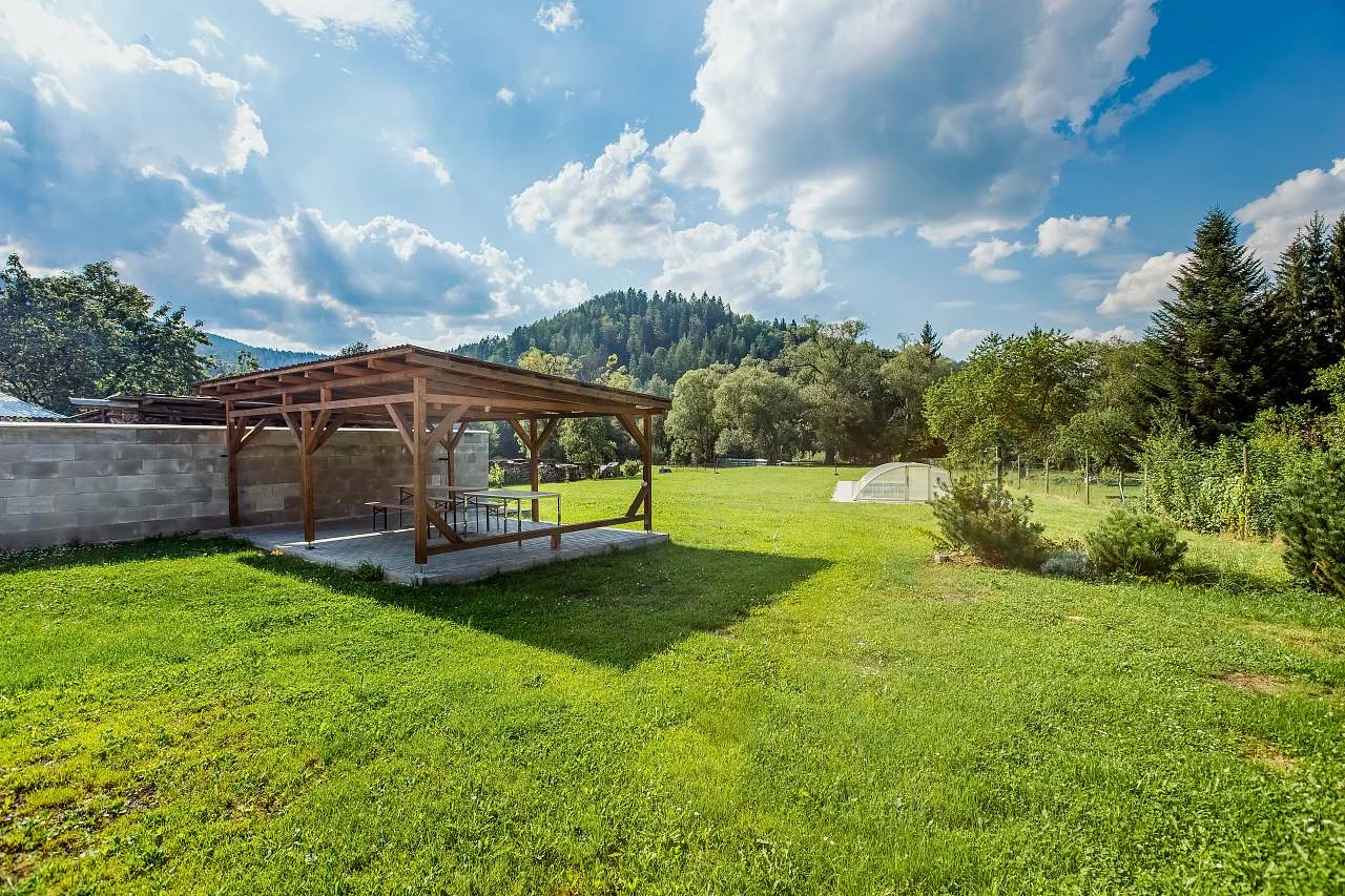 Hosté mají k dispozici velkou soukromou zahradu s přístupem k řece Otavě, ideální pro relaxaci, koupání nebo pikniky. Na zahradě se nacházejí dvě prostorné pergoly s posezením, které jsou vhodné pro snídaně, večerní posezení nebo grilování. Apartmány jsou plně vybavené, včetně kompletní kuchyně a Wi-Fi připojení. Pro hosty je k dispozici bezplatné parkování přímo u objektu. Apartmán rovněž nabízí možnost úschovy kol nebo lyží, což je praktické zázemí pro sportovní vybavení. K dispozici je také venkovní ohniště a gril.