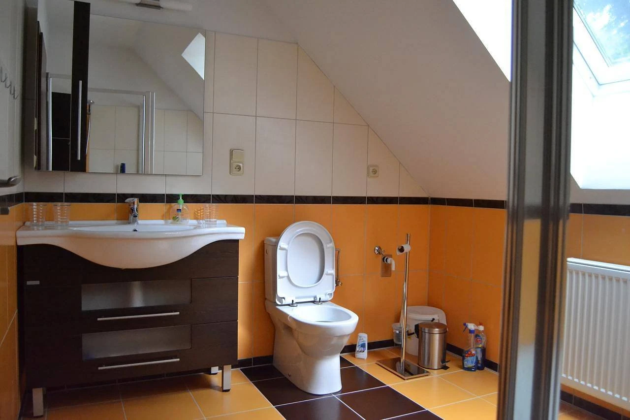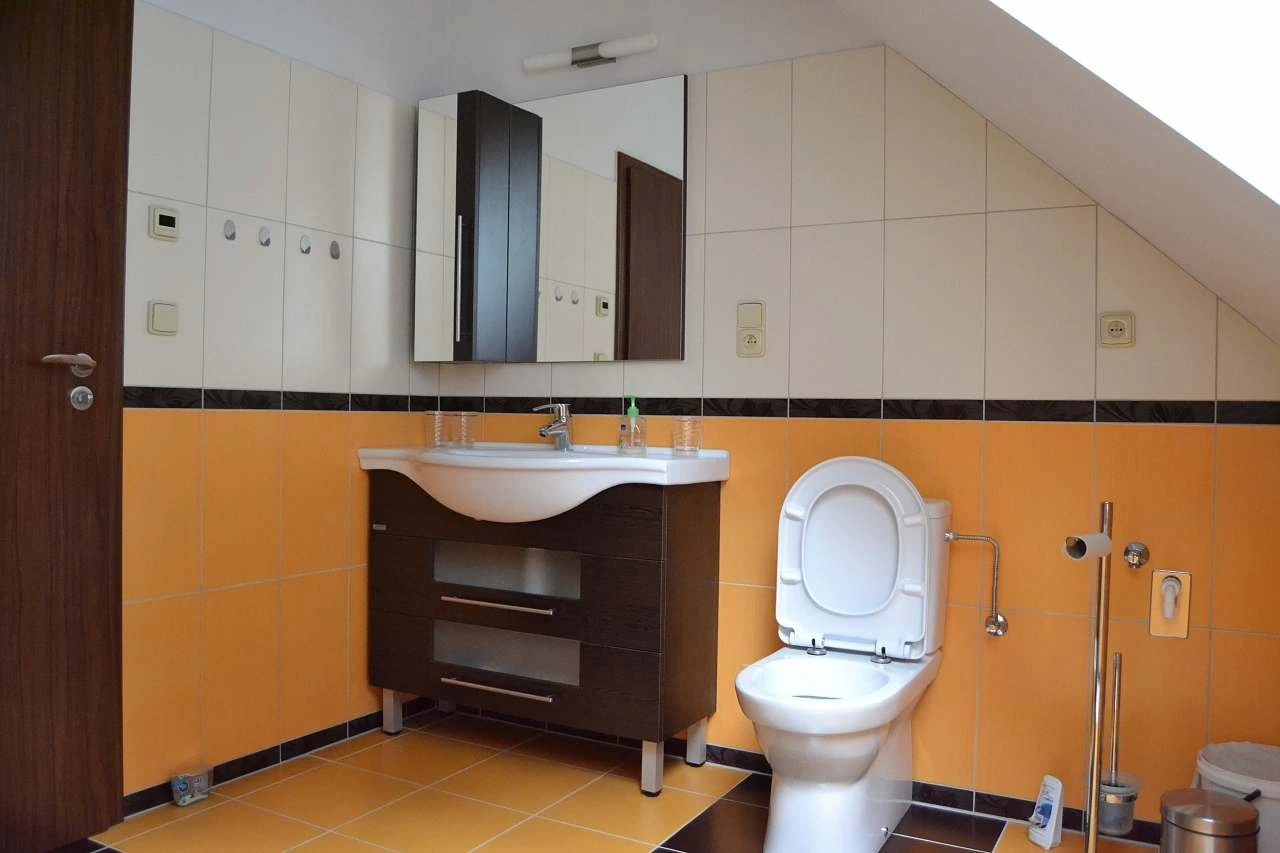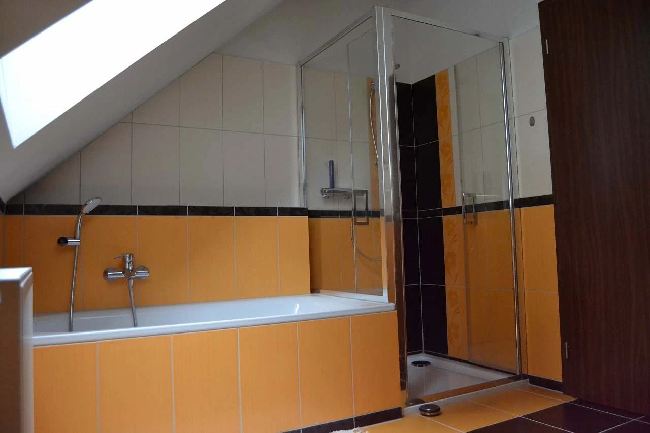 Koupelna obsahuje sprchový kout i vanu. Součástí je také WC a umyvadlo.