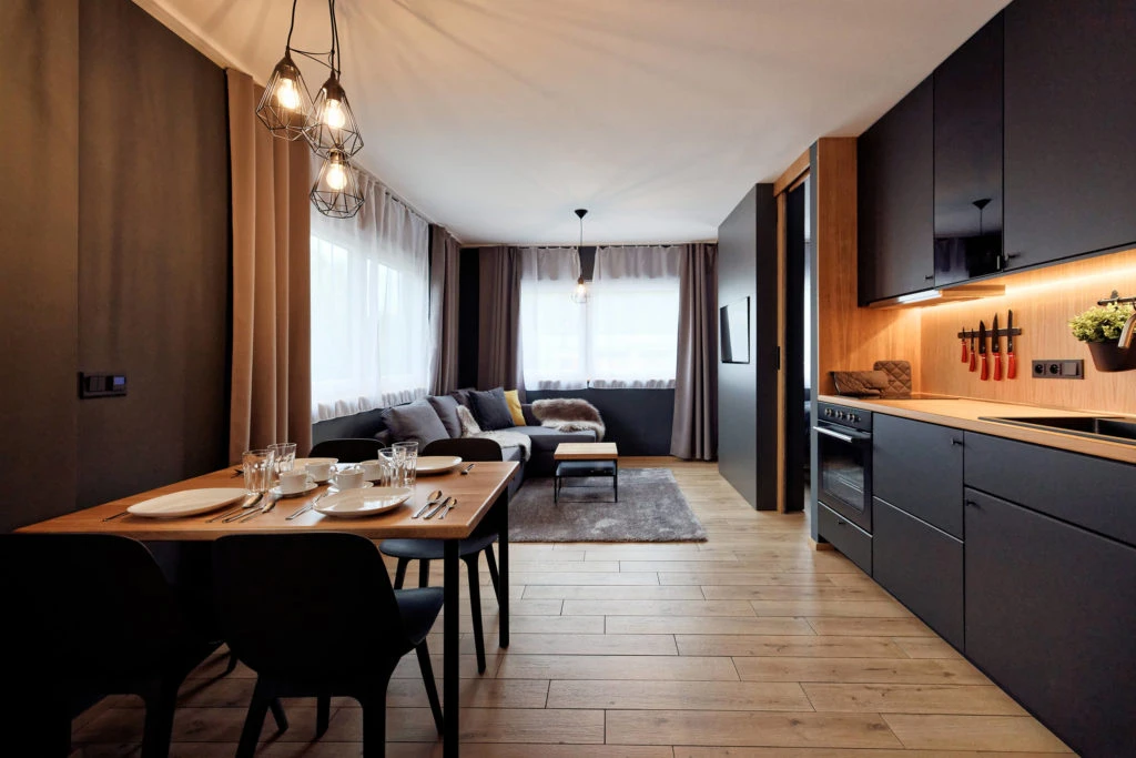 Apartmán se skládá ze dvou samostatných, moderních bytových jednotek. Každá jednotka disponuje ložnicí s manželskou postelí a TV, obývacím pokojem s rozkládací pohovkou a TV, plně vybavenou kuchyní a prostornou koupelnou s WC. Dispozice apartmánu je vhodná jak pro rodiny nebo uzavřené skupiny, tak pro soukromé oslavy, rozlučky se svobodou nebo tematické pobyty.
