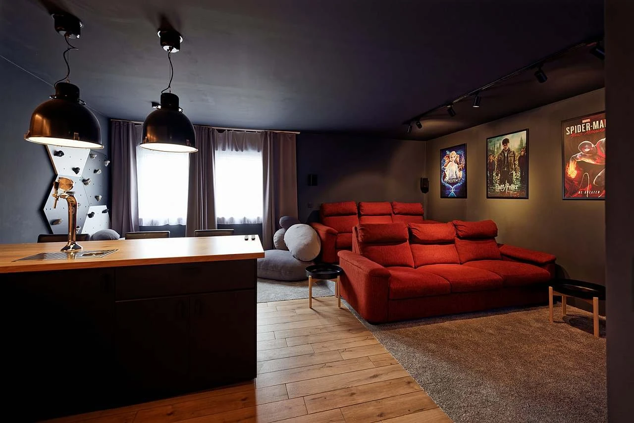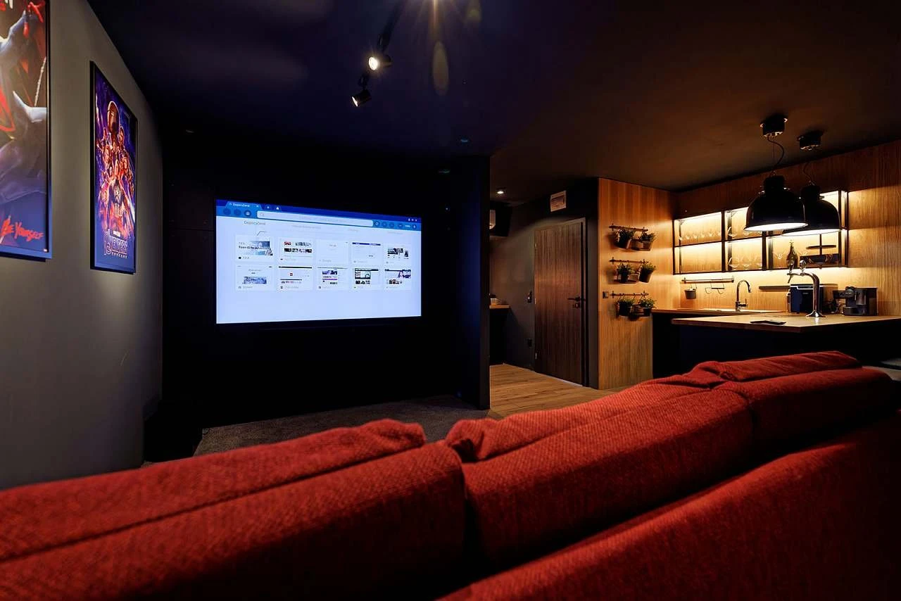 Součástí apartmánu je soukromý kinosál s barem, který je umístěn přímo v objektu. K dispozici jsou pohodlná sedadla, velkoformátové plátno, široká nabídka filmů a profesionální ozvučení 7.1 Dolby Atmos. Přilehlý bar je vybaven výčepním zařízením, ledovačem , kávovarem Nespresso a profesionálním strojem na popcorn.