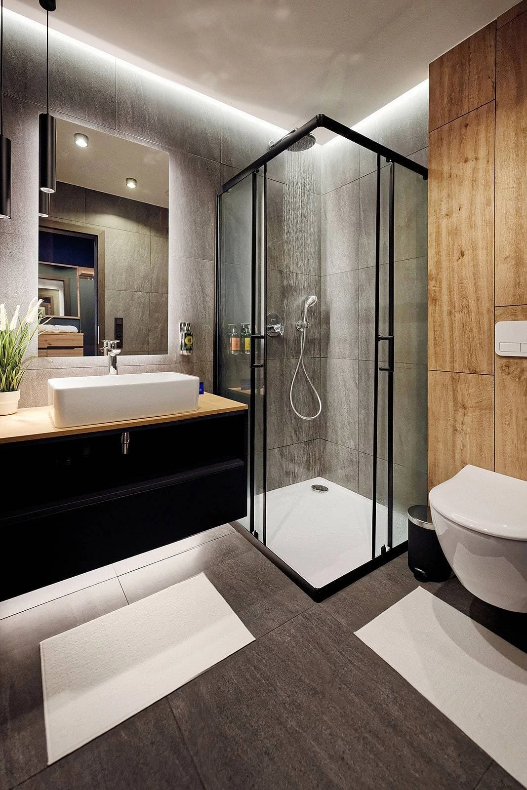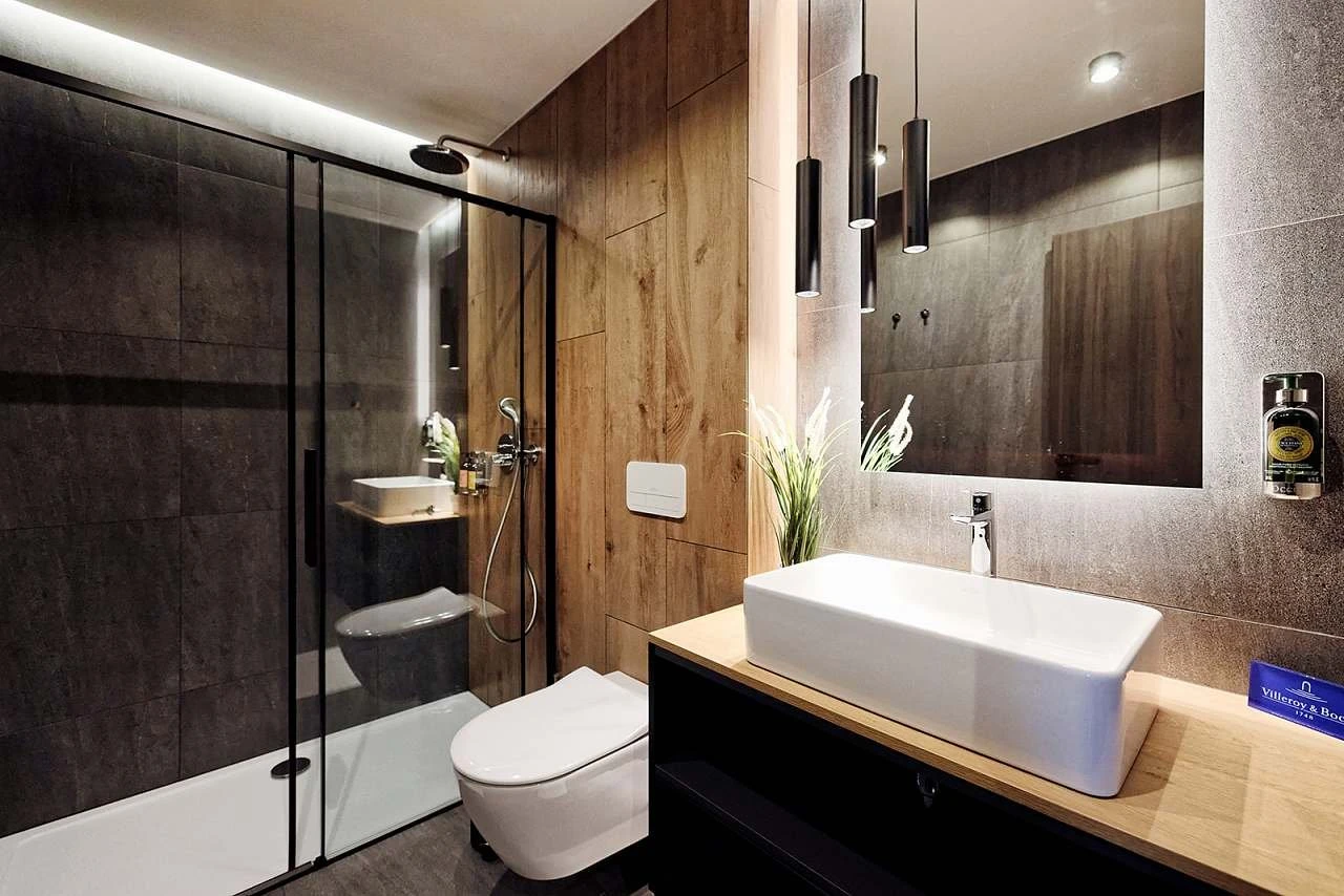 V apartmánu jsou celkem 3 koupelny (3x sprcha, 3 x WC) + privátní wellness (finská sauna, parní sauna, vířivá vana, WC).