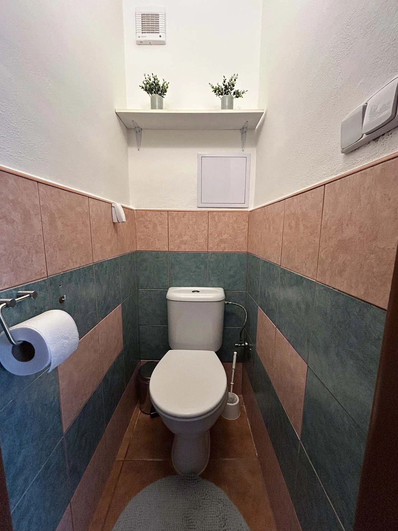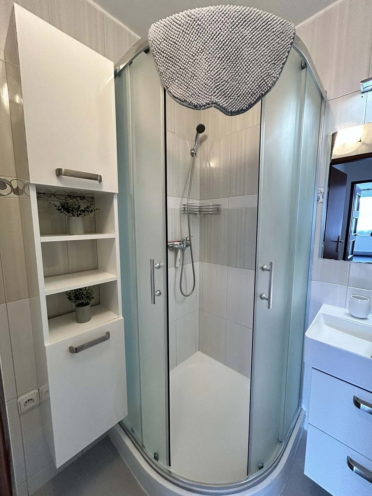 Součástí apartmánu je 1 koupelna se sprchovým koutem a oddělené WC. Vytápění je řešeno pomocí elektrokotle, což umožňuje využití ubytování i v chladnějších obdobích.