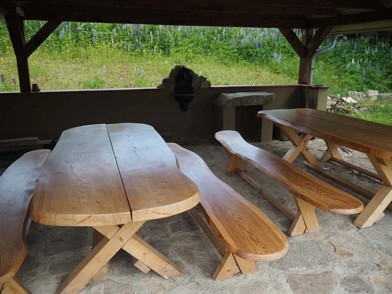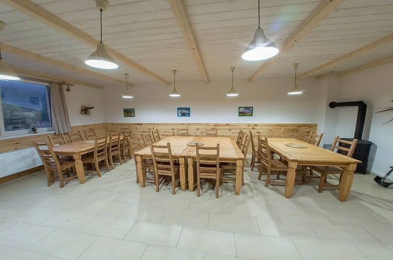 K dispozici je také společenská místnost s velkou kuchyňskou linkou pro společné vaření, krbovými kamny, posezením pro 24 osob, dětským koutkem a WC.