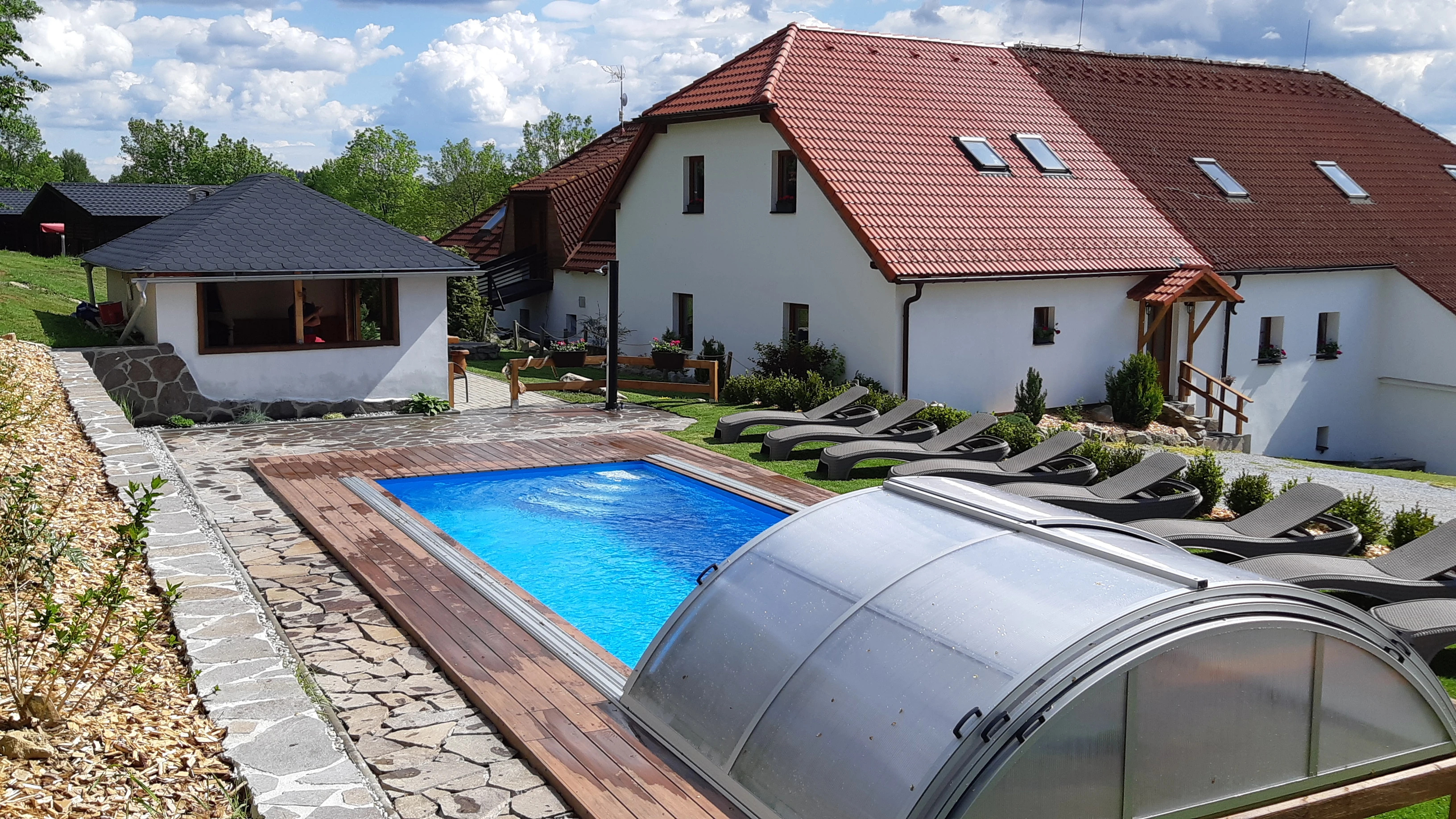 - Střecha nad bazénem umožňuje využití i za deštivého nebo chladnějšího počasí.