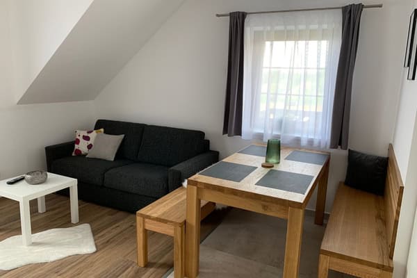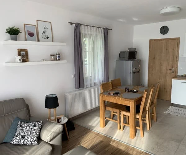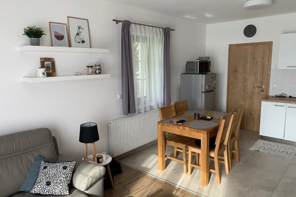 K dispozici je plně vybavená kuchyň, obývací část s TV a rozkládací pohovka pro 2 osoby, jídelní stůl.