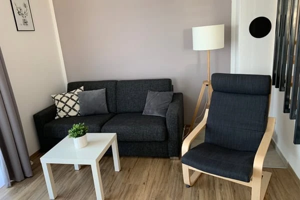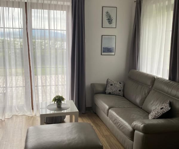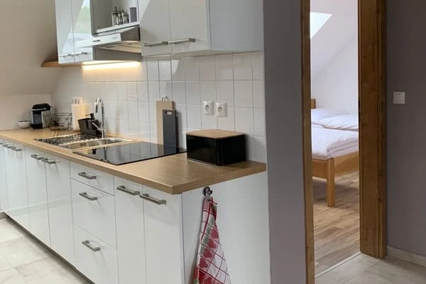 Přístup do apartmánu je po schodišti.K dispozici je plně vybavená kuchyň, obývací část s TV a rozkládací pohovka pro 2 osoby, jídelní stůl.V apartmánu jsou 2 ložnice: jedna pro 3 osoby (3 samostatné postele) a druhá s manželskou postelí.Součástí je koupelna se sprchovým koutem, samostatné WC, ručníky, mýdlo a fén. Povlečení a lůžkoviny jsou zahrnuty.