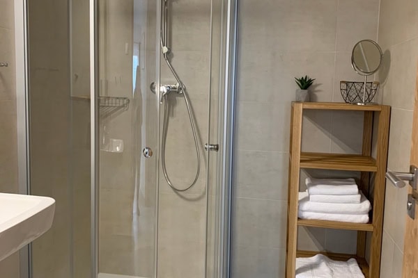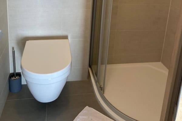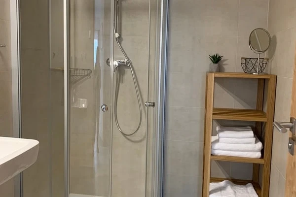Součástí je koupelna se sprchovým koutem, samostatné WC, ručníky, mýdlo a fén. Povlečení a lůžkoviny jsou zahrnuty.