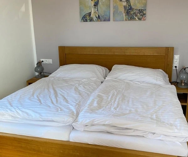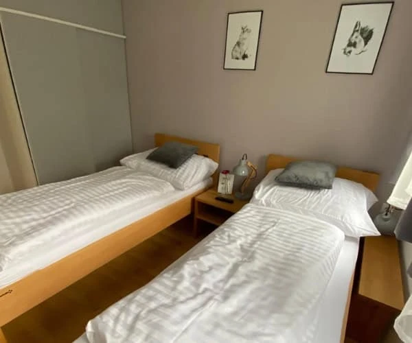 V apartmánu jsou 2 ložnice: jedna pro 3 osoby (3 samostatné postele) a druhá s manželskou postelí.