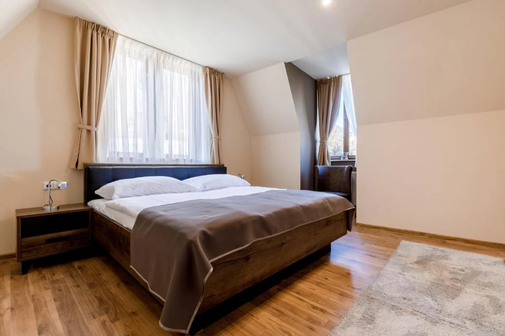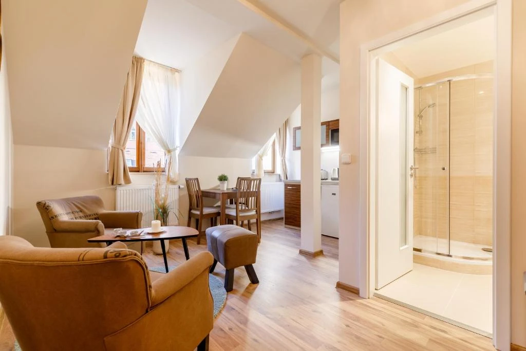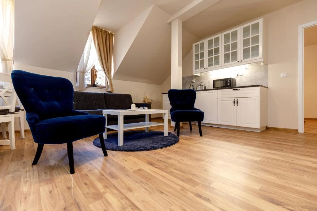 Každý apartmán je vybaven Wi-Fi, klimatizací, televizí a vlastní kuchyňkou, hosté mohou využít pračku. Pro rodiny je k dispozici jídelní židlička a dětská postýlka. Apartmány poskytují komfortní ubytování s důrazem na soukromí a praktické vybavení v centru lázeňského města, v blízkosti restaurací, kaváren, obchodů a přístupových tras do lázeňských lesů.