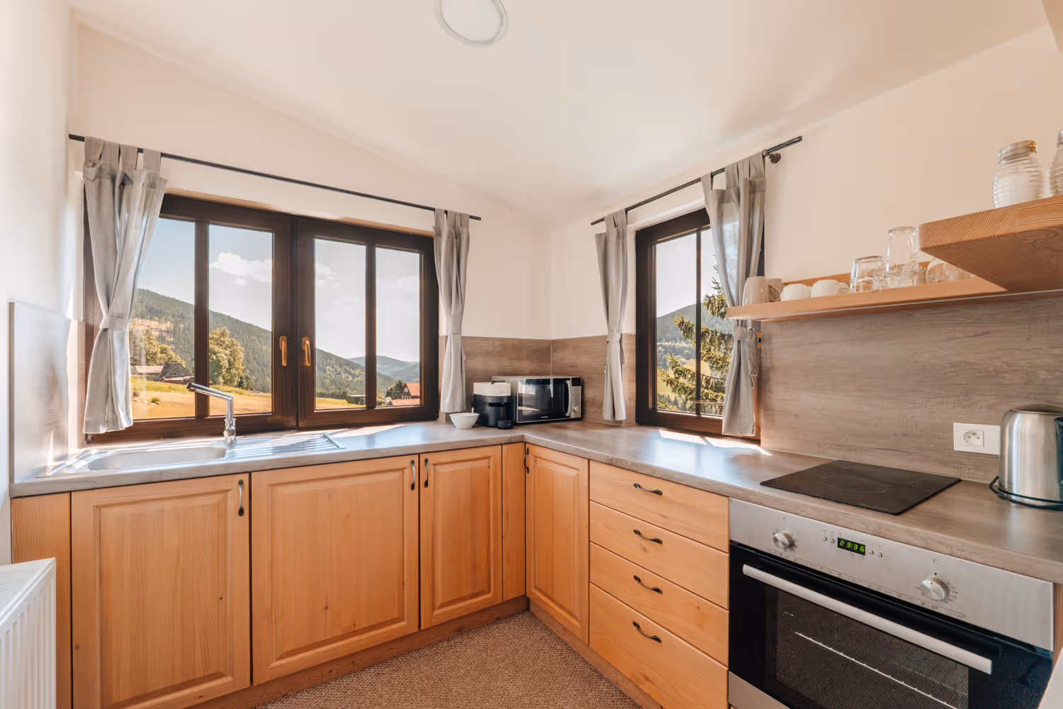 Popis:Apartmán se nachází v prvním patře s výhledem na Velkou Pláň a okolní lesy. Jedná se o studio pro až 4 osoby. Ve studiu je manželská postel a přistýlka (rozkládací postel), kterou lze upravit pro 2 osoby. Součástí vybavení je plně vybavená kuchyně s lednicí, troubou, mikrovlnnou troubou, indukční varnou deskou, kávovarem a rychlovarnou konvicí. V koupelně je toaleta a prostorný sprchový kout.Kapacita:2 osoby + 2 přistýlkyVelikost:30 m²Skladba lůžek:1× dvojlůžko2× přistýlka (rozkládací postel)