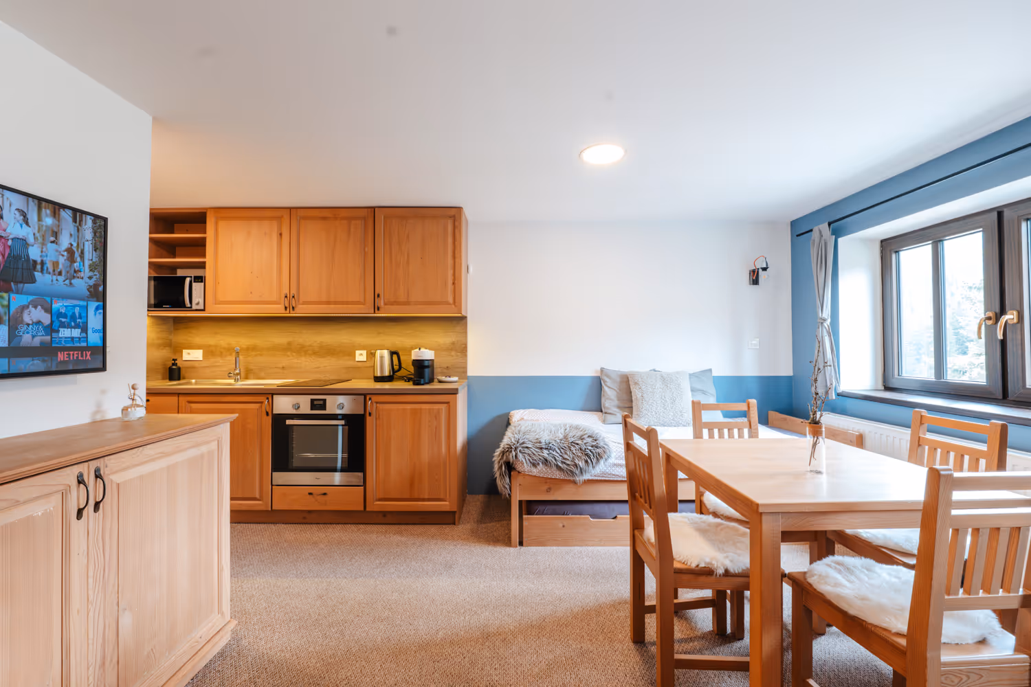 Apartmán v horské roubence o velikosti 35 m². Součástí je plně vybavená kuchyň s kávovarem Nespresso, troubou a myčkou, dále koupelna s prostorným sprchovým koutem. Ve dvou ložnicích je celkem 6 lůžek, velká TV a pracovní stůl.