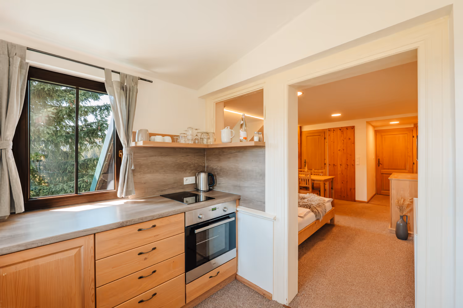 Apartmán se nachází v přízemí s výhledem do areálu a okolních lesů. Jedná se o studio pro až 4 osoby. Ve studiu je manželská postel a přistýlka (rozkládací postel), kterou lze rozložit pro 2 osoby. Součástí vybavení je plně vybavená kuchyně s lednicí, troubou, mikrovlnnou troubou, indukční varnou deskou, kávovarem a rychlovarnou konvicí. V koupelně se nachází toaleta a prostorný sprchový kout.