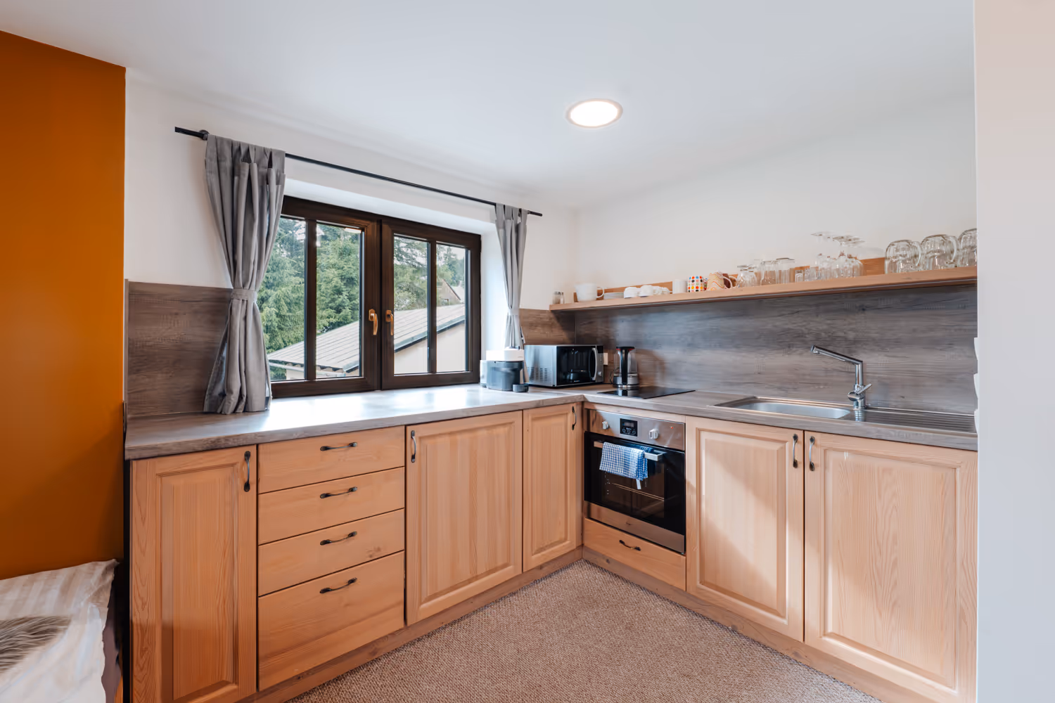 Popis:Apartmán se nachází v přízemí s výhledem do areálu a okolních lesů. Jedná se o studio pro až 4 osoby. Ve studiu je manželská postel a přistýlka (rozkládací postel), kterou lze rozložit pro 2 osoby. Součástí vybavení je plně vybavená kuchyně s lednicí, troubou, mikrovlnnou troubou, indukční varnou deskou, kávovarem a rychlovarnou konvicí. V koupelně se nachází toaleta a prostorný sprchový kout.Kapacita:2 osoby + 2 přistýlkyVelikost:25 m²Skladba lůžek:1× dvoulůžko2× přistýlka (rozkládací postel)