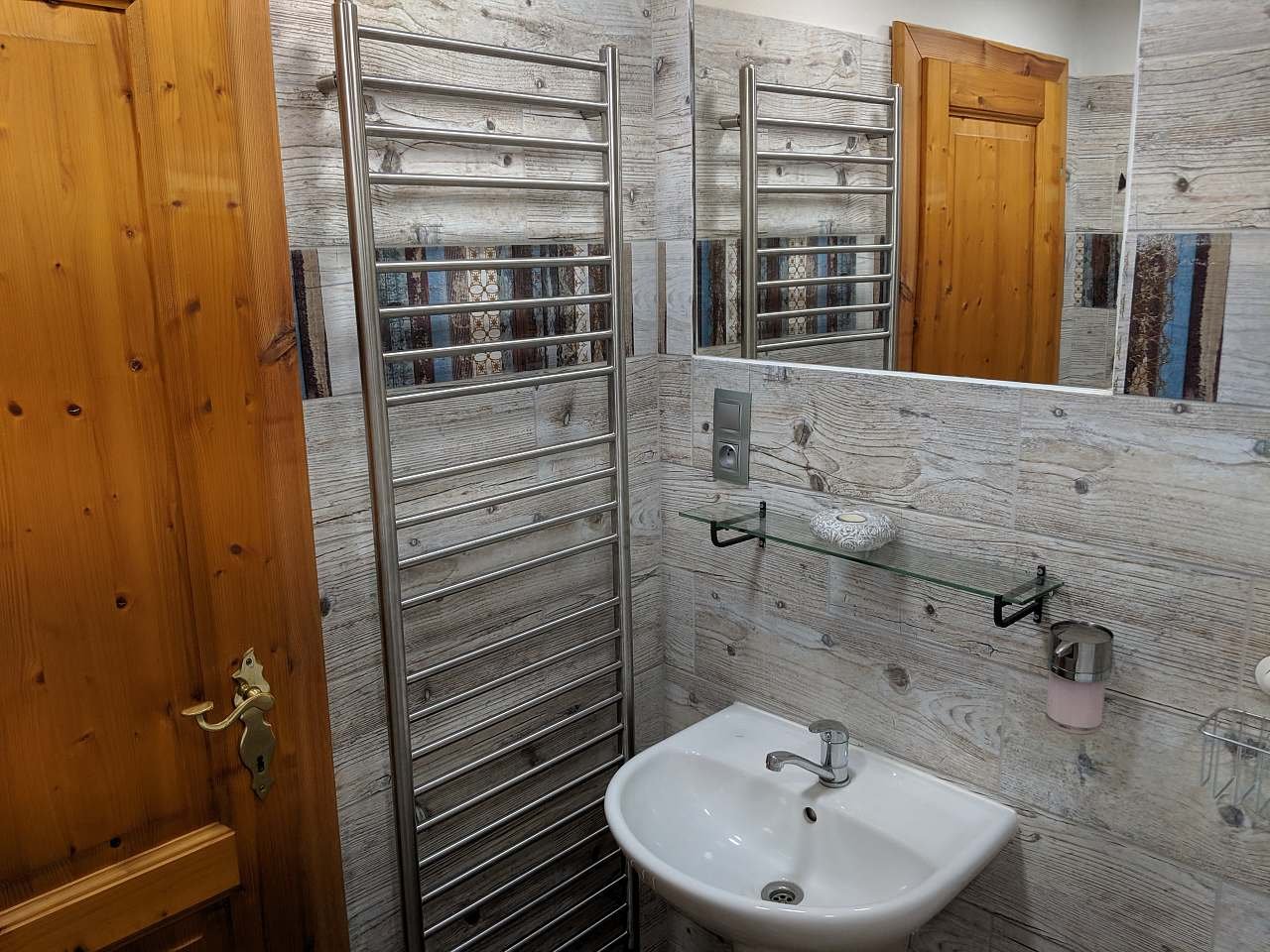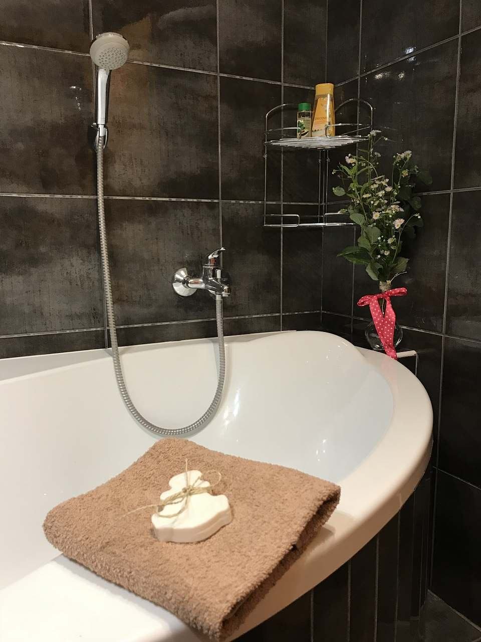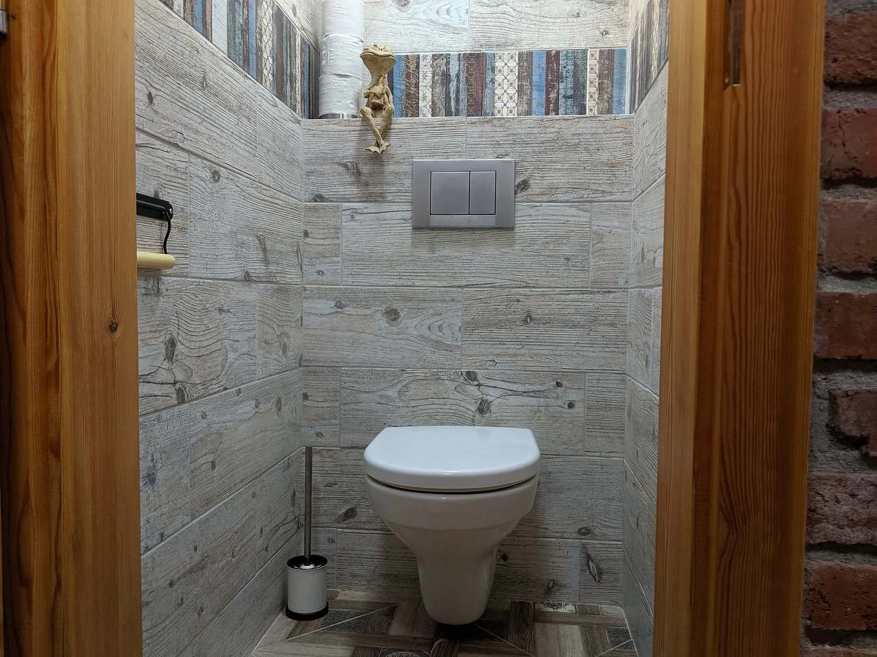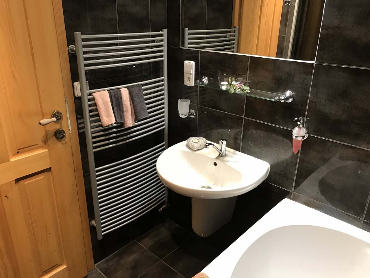 Součástí jsou dvě koupelny – jedna s rohovou vanou, druhá se sprchovým koutem. K dispozici jsou také 2 toalety.