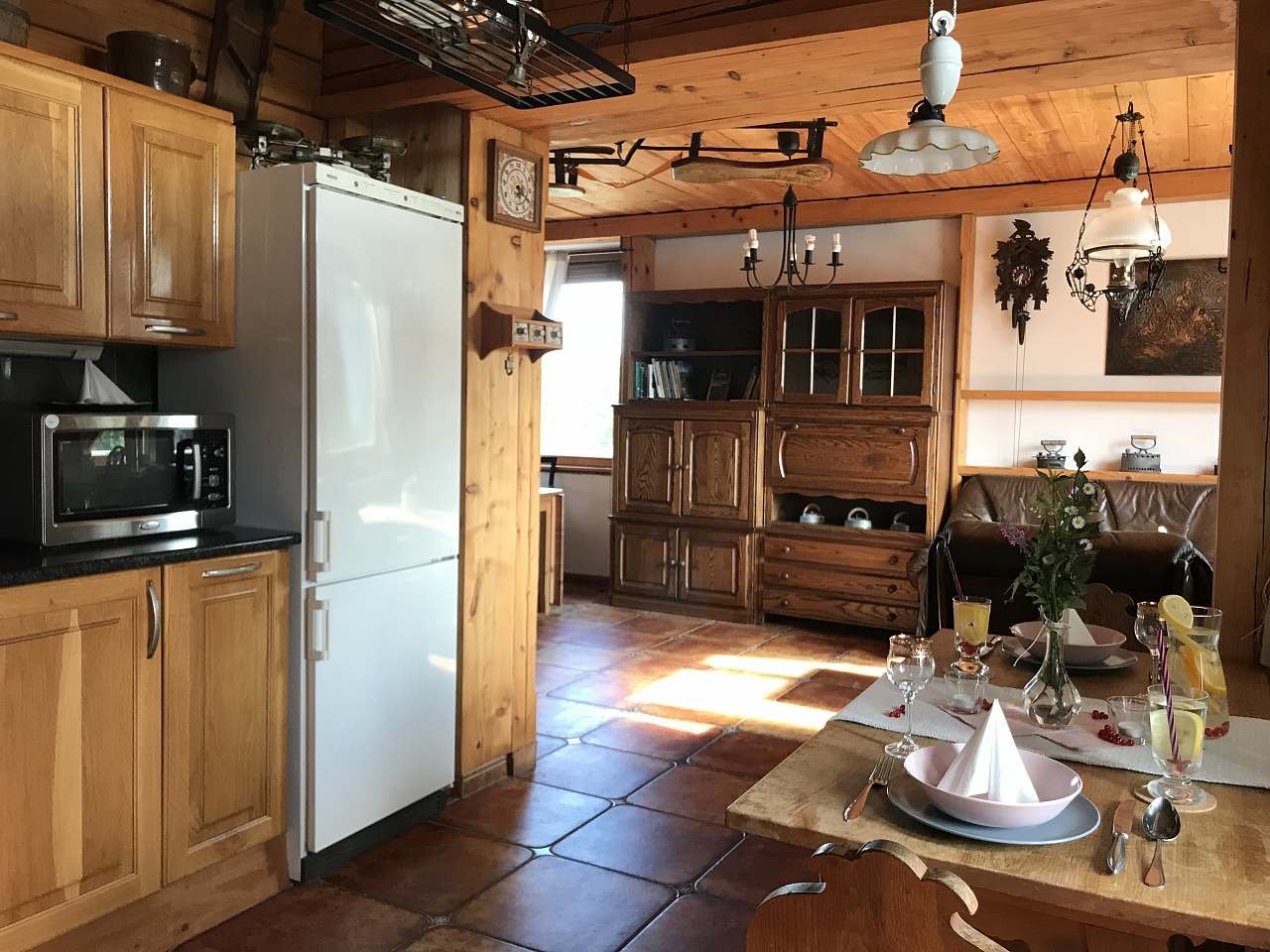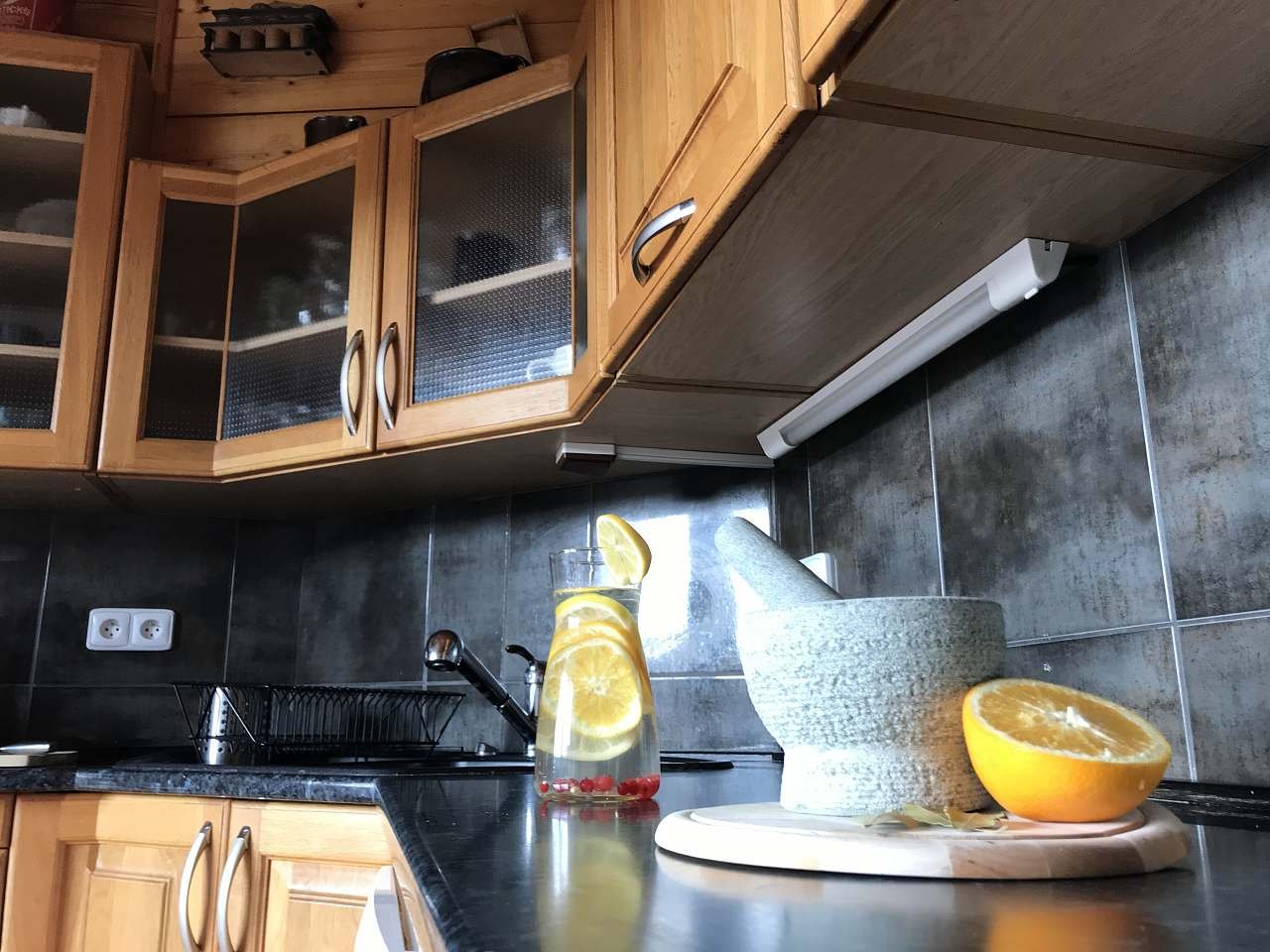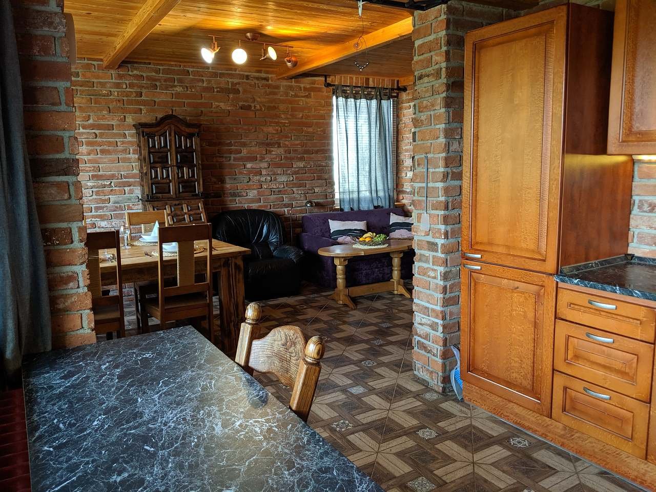 Dispozice zahrnuje obývací pokoj propojený s kuchyní. Součástí obývací části je velká LCD televize a jídelní stůl pro až 7 osob. Kuchyň je plně vybavená – obsahuje myčku nádobí, varnou desku, troubu a lednici s mrazákem. Z kuchyně je přístup na balkon.