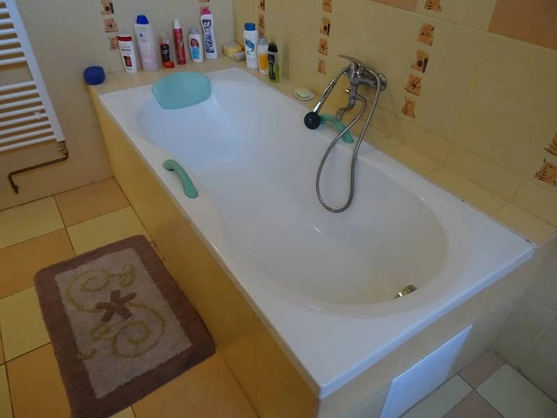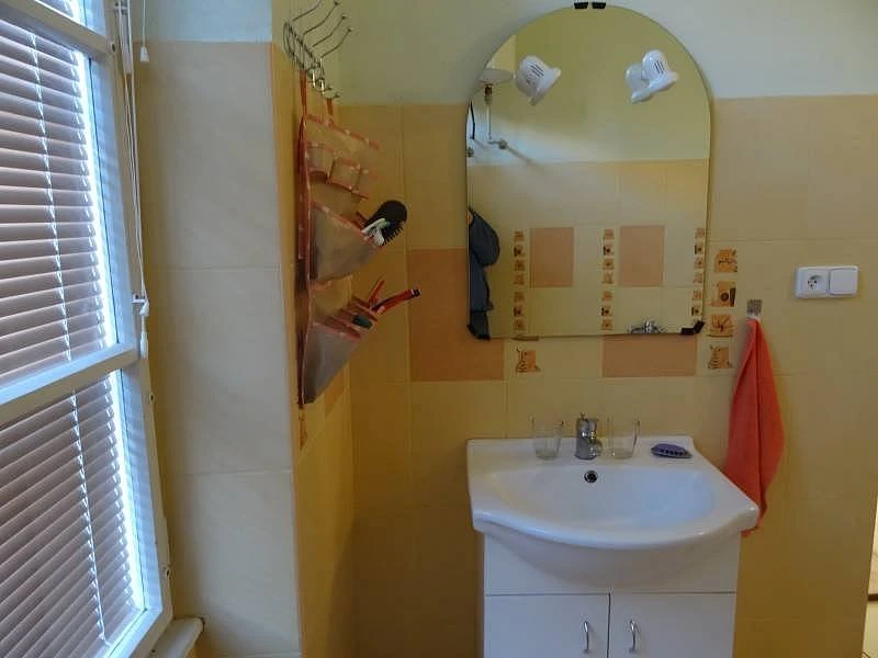 Koupelna je vybavena vanou, sprchou, vyhřívanou podlahou, umyvadlem. K dispozici je také samostatné WC s umyvadlem.