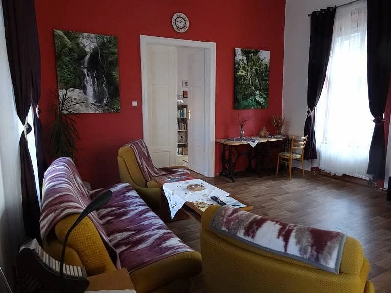 V obývacím pokoji se nachází jídelní stůl pro 6 osob, internetová televize, DVD přehrávač, rádio, sedací souprava se dvěma křesly, konferenční stolek a krb na dřevo napojený na ústřední topení.