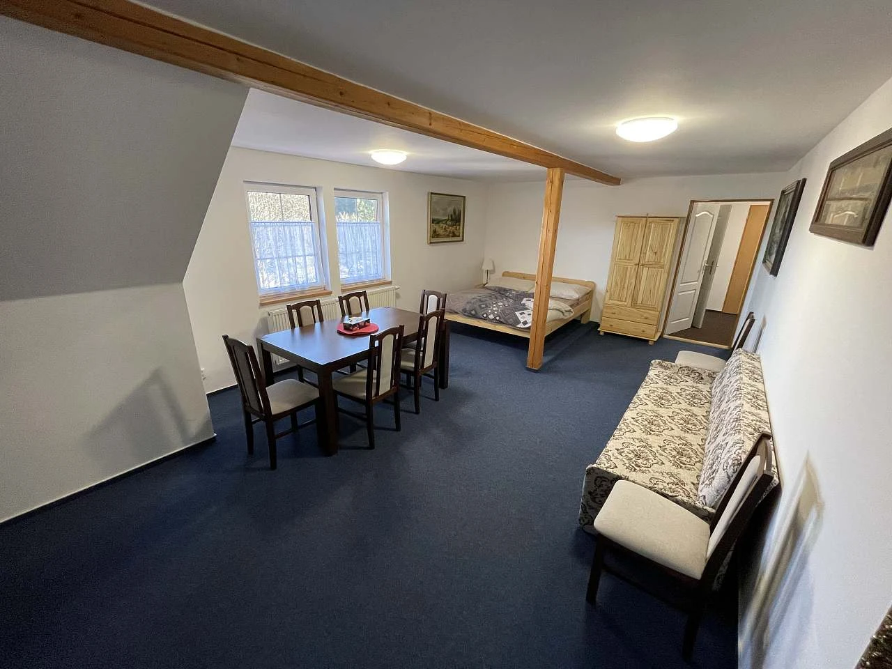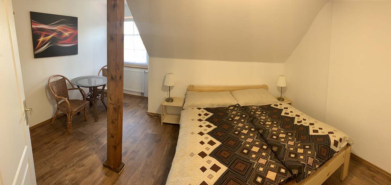 - Jedna obytná ložnice s jídelním stolem pro 6 osob a manželskou postelí (160 cm).