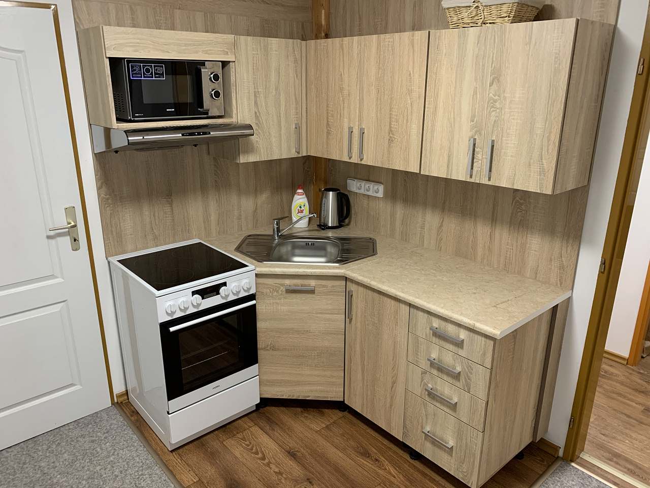 Každý apartmán je vybaven kuchyňským koutem s lednicí, mikrovlnnou troubou, troubou, varnou deskou a rychlovarnou konvicí. Koupelny v apartmánech zahrnují sprchový kout s termostatickou hlavicí, topný žebřík na sušení ručníků, umyvadlo a WC. Vytápění objektu je centrální a obsluhuje jej majitel.
