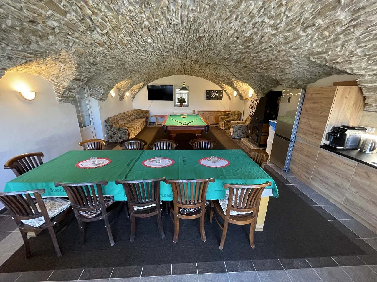 Hosté mají přístup k velké společenské místnosti, která je vybavena kulečníkem, šipkami, badmintonem, kroketem, velkým stolem s 12 židlemi, lednicí s mrazákem, rychlovarnou konvicí, kávovarem, myčkou na nádobí a kompletním nádobím. Novinkou je možnost využití výčepního zařízení na dva sudy poháněného biogonem pro točené nápoje.